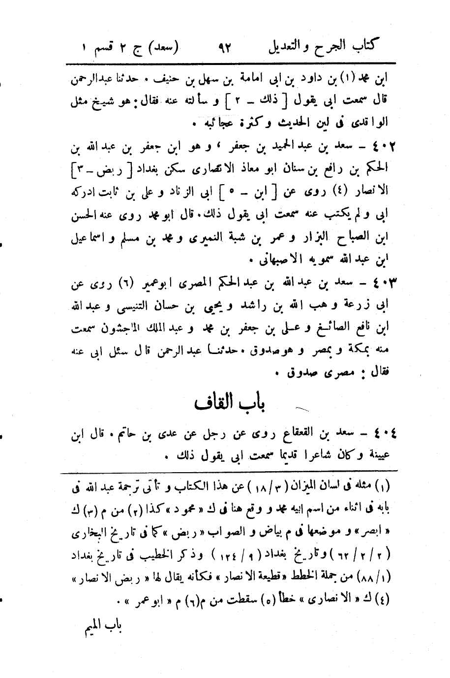 402 - سعد بن عبد الحميد بن جعفر، وهو ابن جعفر بن عبد الله بن الحكم بن رافع بن سنان أبو معاذ الأنصاري سكن بغداد [ربض - 3] الأنصار (4) روى عن [ابن - 5] أبي الزناد وعلي بن ثابت أدركه أبي ولم يكتب عنه سمعت أبي يقول ذلك.