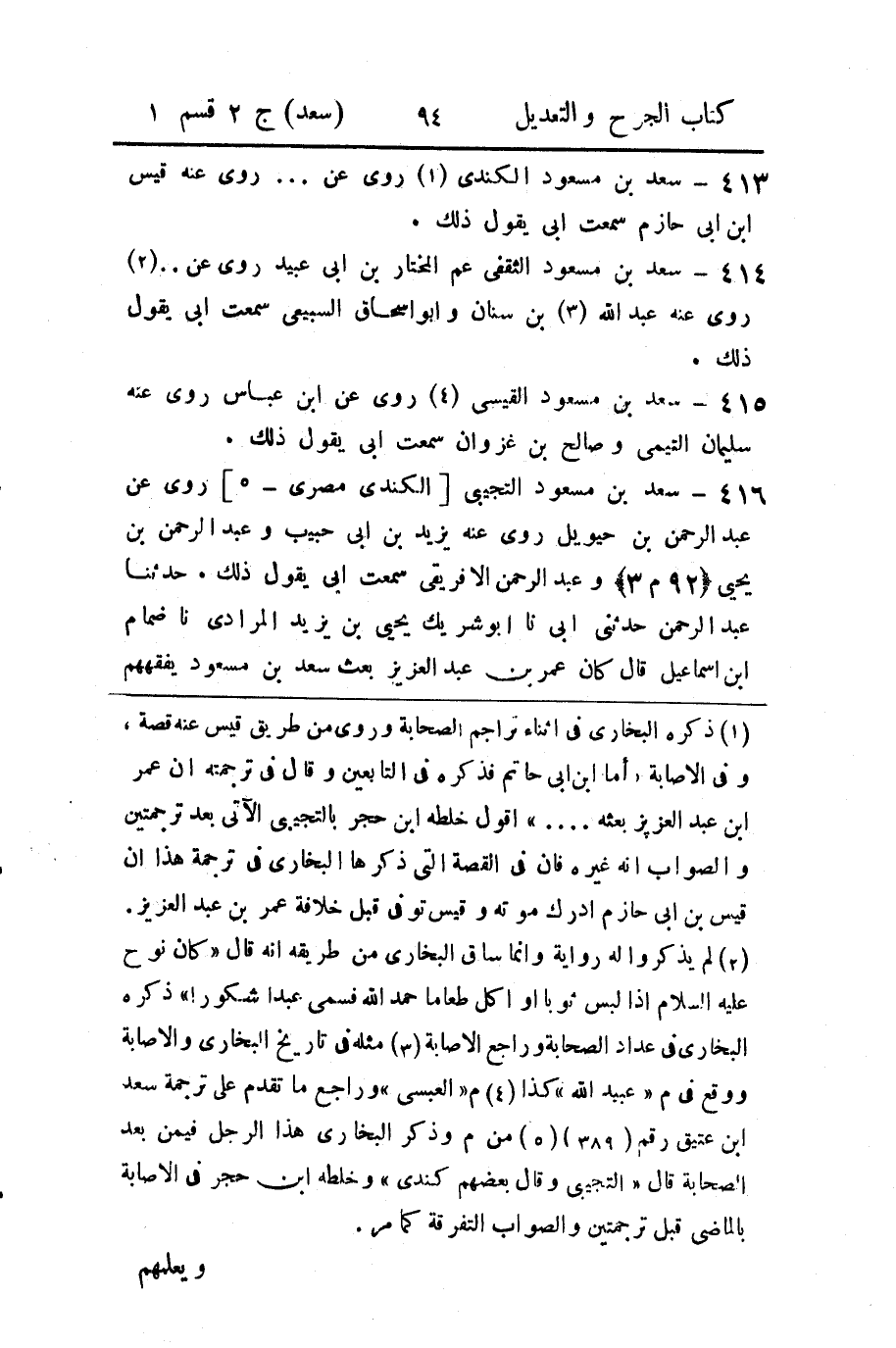 416 - سعد بن مسعود التجيبي [الكندي مصري - 5] روى عن عبد الرحمن بن حيويل روى عنه يزيد بن أبي حبيب وعبد الرحمن بن يحيى (92 م 3) وعبد الرحمن الإفريقي سمعت أبي يقول ذلك.