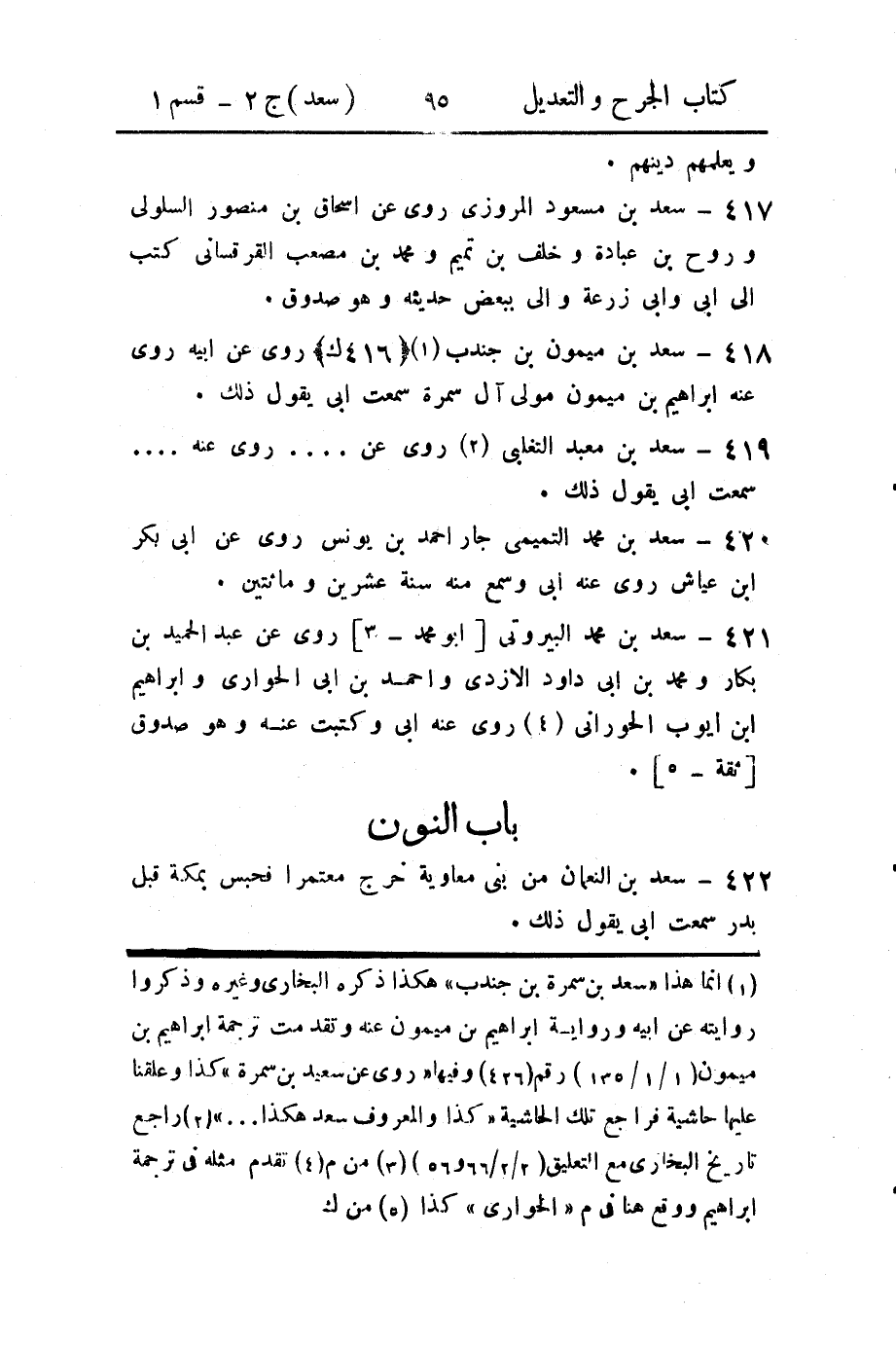 (1) انما هذا " سعد بن سمرة بن جندب " هكذا ذكره البخاري وغيره وذكروا روايته عن ابيه ورواية ابراهيم بن ميمون عنه وتقدمت ترجمة ابراهيم بن ميمون (1 / 1 / 135) رقم (426) وفيها " روى عن سعيد بن سمرة " كذا وعلقنا عليها حاشية فراجع تلك الحاشية " كذا والمعروف سعد هكذا ... " (2) راجع تاريخ البخاري مع التعليق (2 / 2 / 66 و 56) (3) من م (4) تقدم مثله في ترجمة ابراهيم ووقع هنا في م " الحوارى " كذا (5) من ك (*)