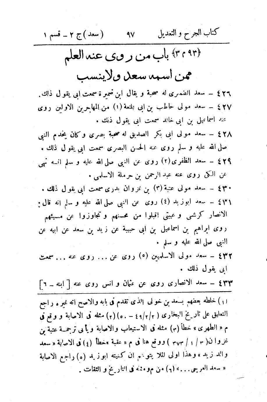 (1) خلطه بعضهم بسعد بن خولى الذى تقدم في بابه والاصح انه غيره راجع التعليق على تاريخ البخاري (2 / 2 / 49 - 50) (2) مثله في الاصابة ووقع في م " الطهرى " خطأ (3) مثله في الاستيعاب والاصابة ويأتى ترجمة عتبة بن غزوان (3 / 1 / 373) ووقع هنا في م " عقبة " خطأ (4) في الاصابة " سعد والد زيد " وهذا اولى لئلا يتوهم ان كنيته أبو زيد (5) راجع الاصابة " سعد العرجى ... " (6) من م ومثله في التاريخ والثقات.