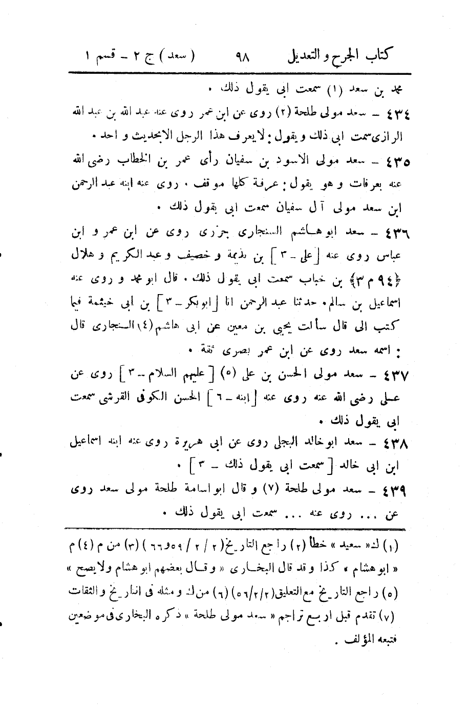 (1) ك " سعيد " خطأ (2) راجع التاريخ (2 / 2 / 59 و 66) (3) من م (4) م " أبو هشام " كذا وقد قال البخاري " وقال بعضهم أبو هشام ولا يصح " (5) راجع التاريخ مع التعليق (2 / 2 / 56) (6) من ك ومثله في التاريخ والثقات (7) تقدم قبل اربع تراجم " سعد مولى طلحة " ذكره البخاري في موضعين فتبعه المؤلف.