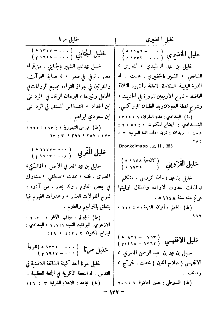 (ط) فهرس التيمورية 1: 163، 225، 275، 287، 292، 3: 63 خليل المغربي (000 - 1177 هـ) (000 - 1763 م) خليل بن محمد المغربي الاصل، المالكي، المصري.