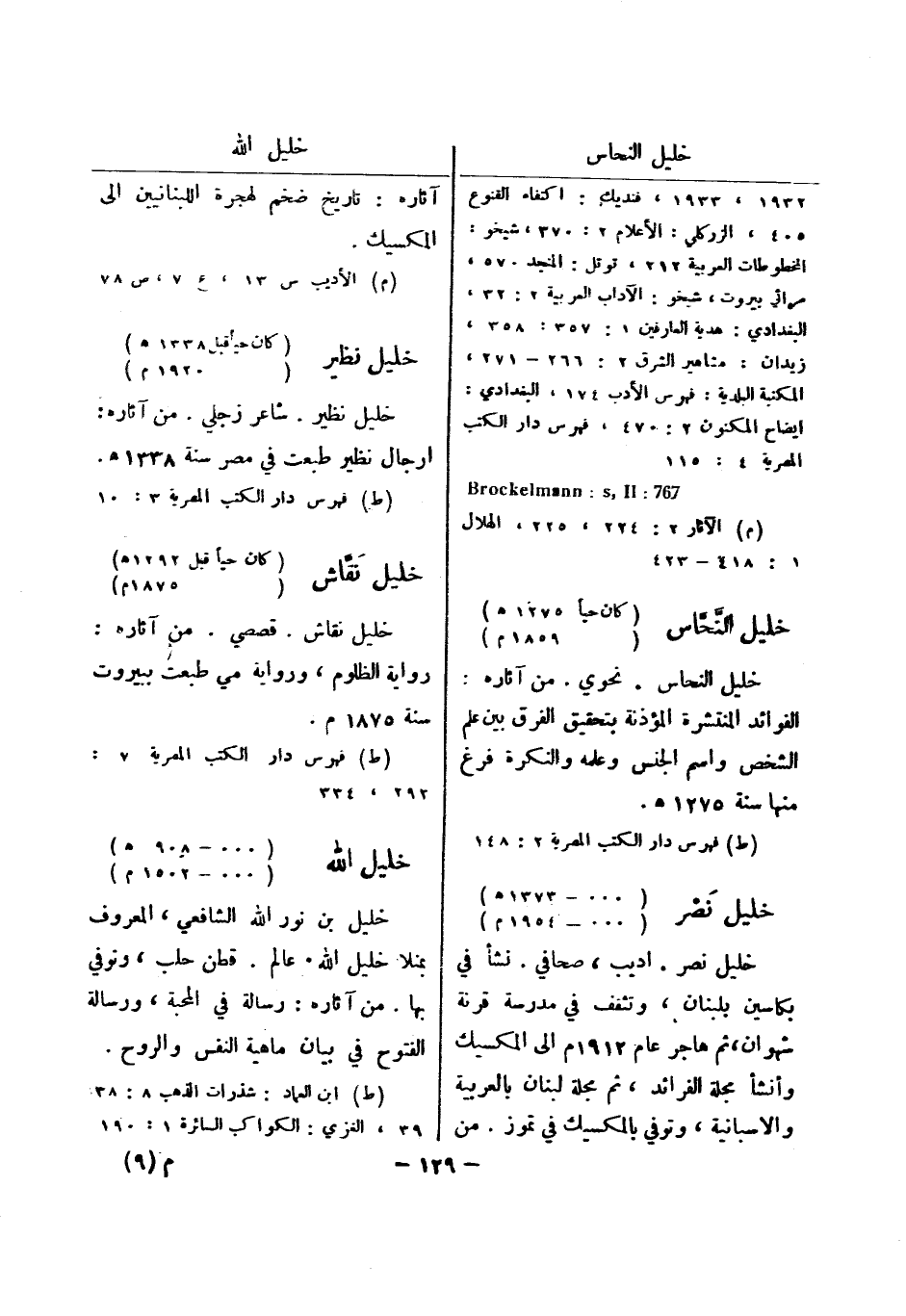 زيدان: مشاهير الشرق 2: 266 - 271، المكتبة البلدية: فهرس الادب 174، البغدادي: ايضاح المكنون 2: 470، فهرس دار الكتب المصرية 4: 115 767: Brockelmann: s , II (م) الآثار 2: 224، 225، الهلال 1: 418 - 423 خليل النحاس (كان حيا 1275 هـ) (1859 م) خليل النحاس.