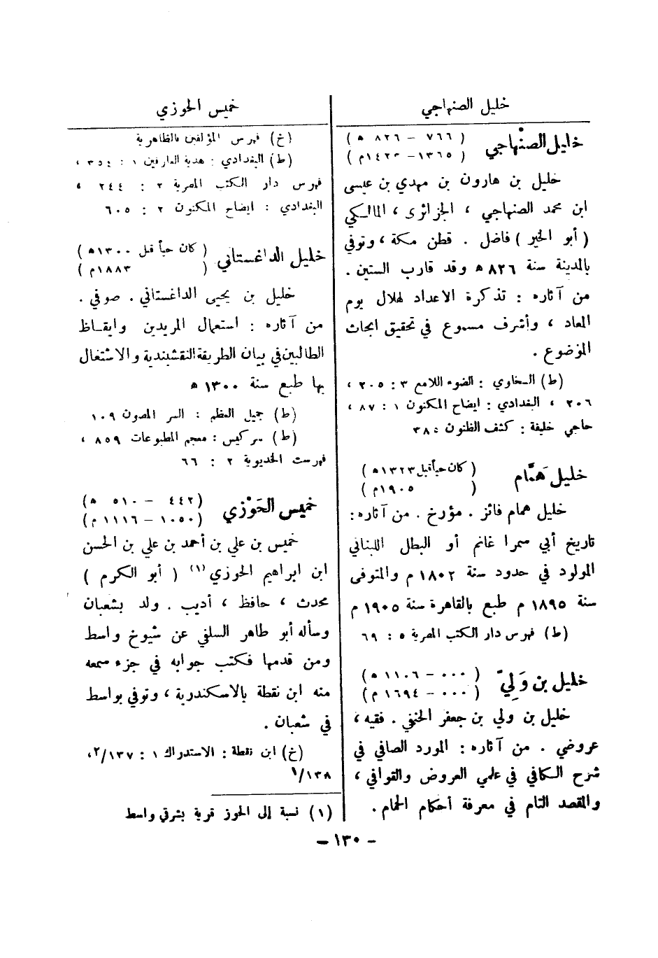 (ط) السخاوي: الضوء اللامع 3: 205، 206، البغدادي: ايضاح المكنون 1: 87، حاجي خليفة: كشف الظنون 385 خليل همام (كان حيا قبل 1323 هـ) (1905 م) خليل همام فائز.