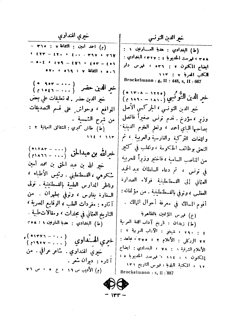 (ط) البغدادي: هدية العارفين 1: 358، فهرست الخديوية 4: 327، البغدادي: ايضاح المكنون 2: 536، فهرس دار الكتب المصرية 7: 113 667: II: 844 , s , II، Brockelmann: g خير الدين التونسي (1225 - 1308 هـ) (1810 - 1890 م) خير الدين التونسي، الجركسى الاصل وزير، مؤرخ.