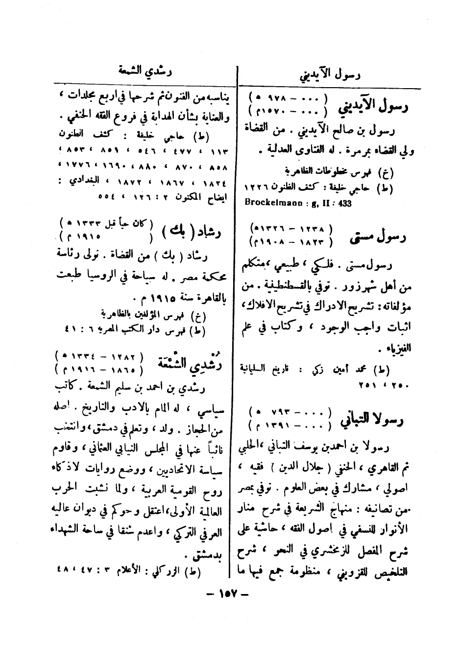 (ط) حاجي خليفة: كشف الظنون 113، 477، 546، 851، 853، 858، 870، 880، 1690، 1776، 1824، 1867، 1872، البغدادي: ايضاح المكنون 2: 126، 554 رشاد (بك) (كان حيا قبل 1333 هـ) (1915 م)