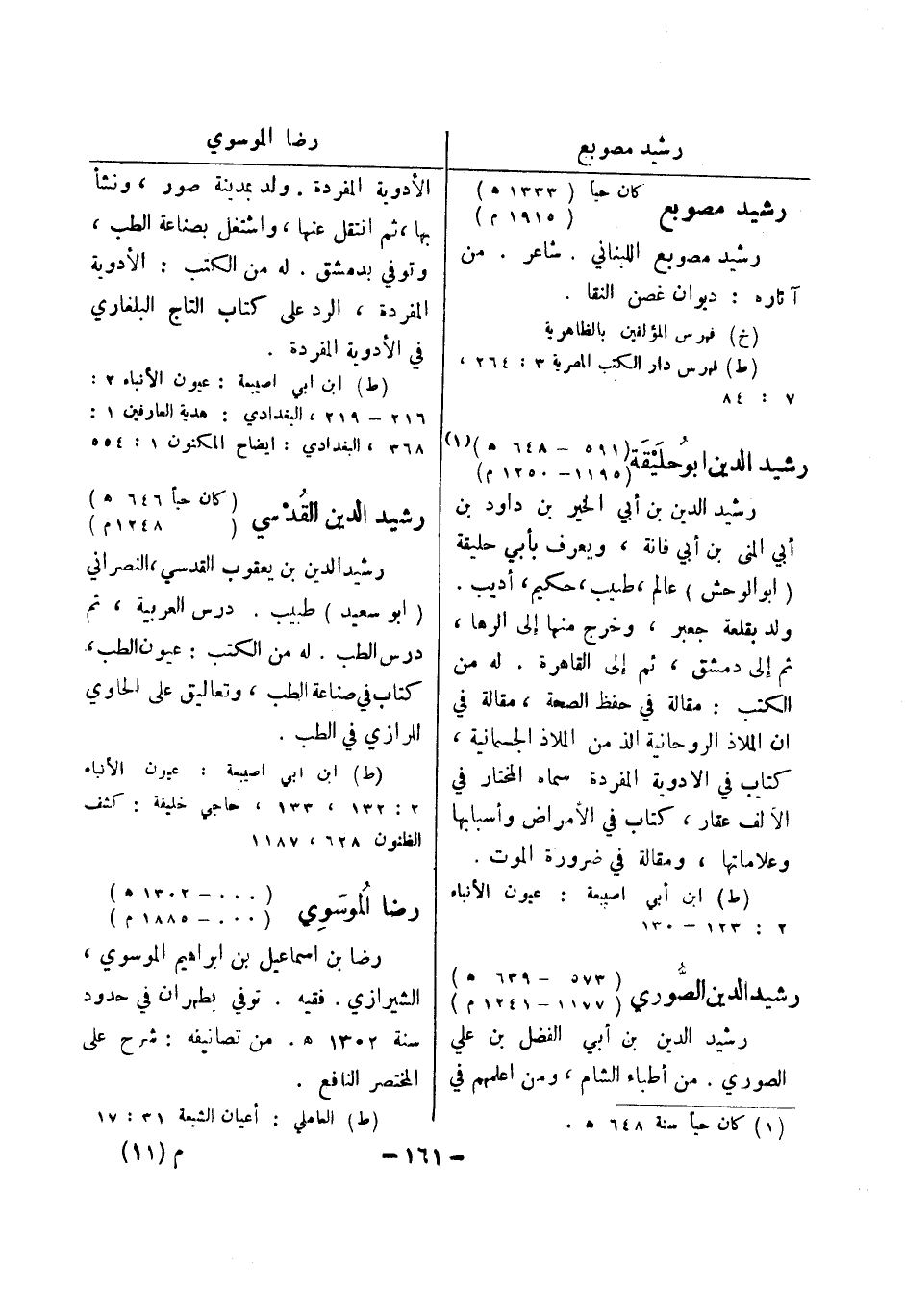 (ط) ابن أبي اصيبعة: عيون الانباء 2: 123 - 130 رشيد الدين الصوري (573 - 639 هـ) (1177 - 1241 م) رشيد الدين بن أبي الفضل بن علي الصوري.