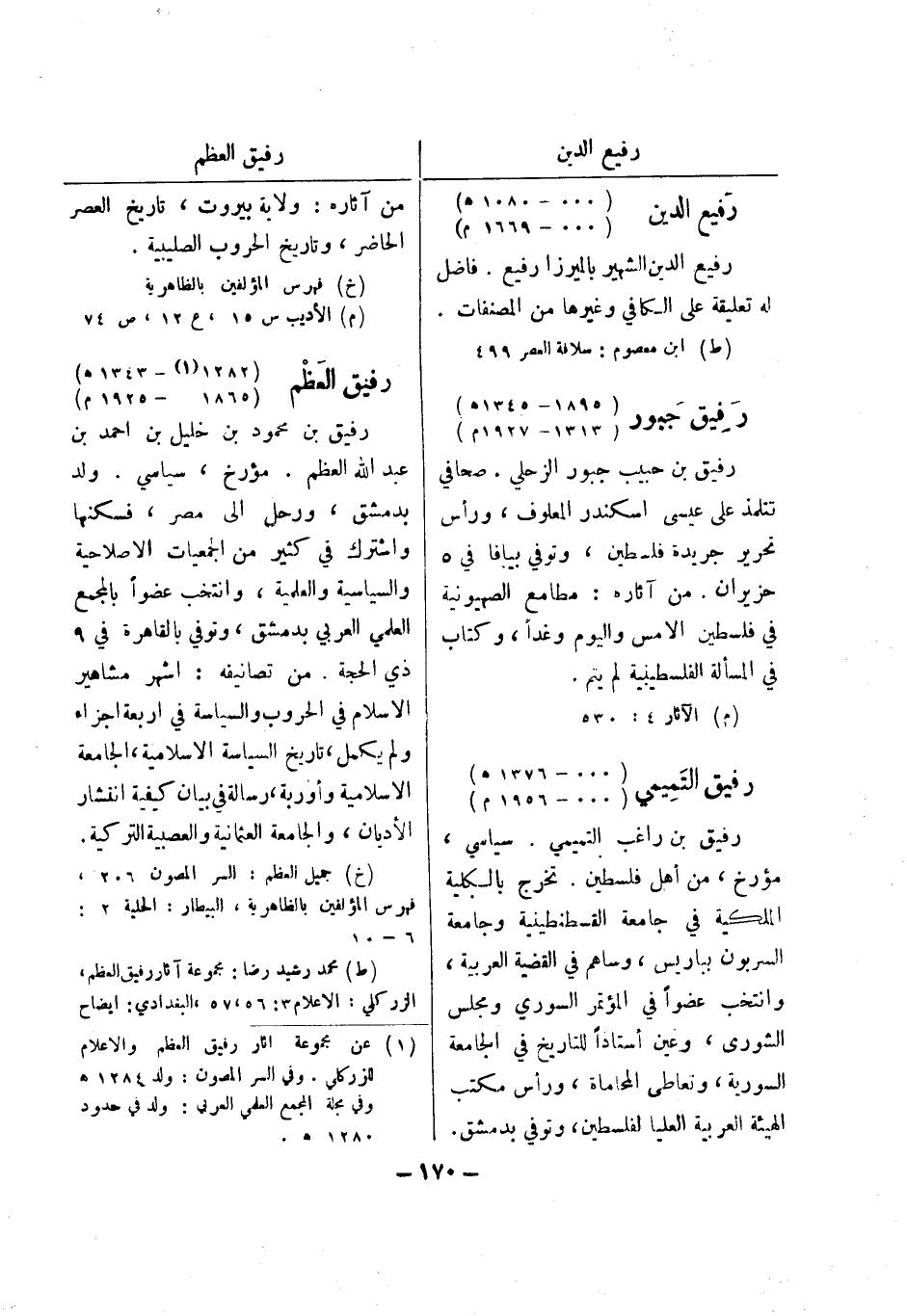 (خ) فهرس المؤلفين بالظاهرية (م) الاديب س 15، ع 12، ص 74 رفيق العظم (1282 (1) - 1343 هـ) (1865 - 1925 م) رفيق بن محمود بن خليل بن احمد بن عبد الله العظم.
