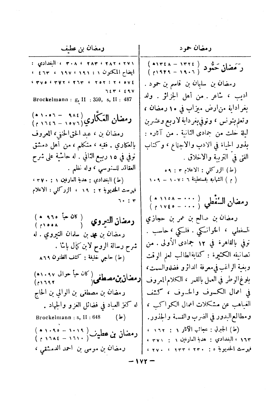 (ط) الجبرتي: عجائب الآثار 1: 162، 163، البغدادي: هدية العارفين 1: 371، فهرست الخديوية 5: 230، 233، 270، 271، 282، 283، 308، البغدادي: ايضاح المكنون 1: 191، 197، 463، 574، 2: 252، 263، 372، 375، 497، 643 487: Brockelmann: g , II: 953 , s , II رمضان العكاري (984 - 1056 هـ) (1576 - 1646 م) رمضان بن، عبد الحق الحنفي، المعروف بالعكاري.
