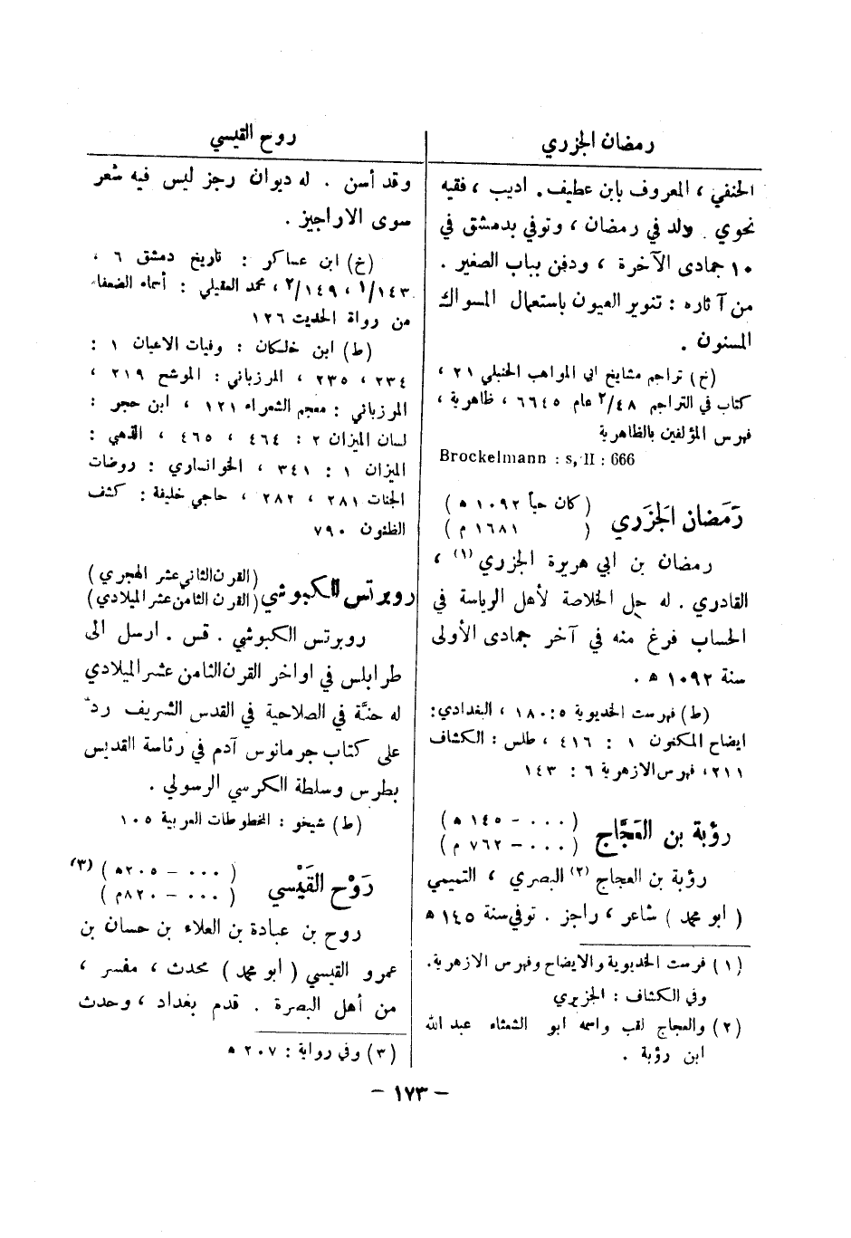 (ط) شيخو: المخطوطات العربية 105 روح القيسي (000 - 205 هـ) (3) (000 - 820 م) روح بن عبادة بن العلاء بن عمرو القيسي (أبو محمد) محدث، مفسر، من أهل البصرة.
