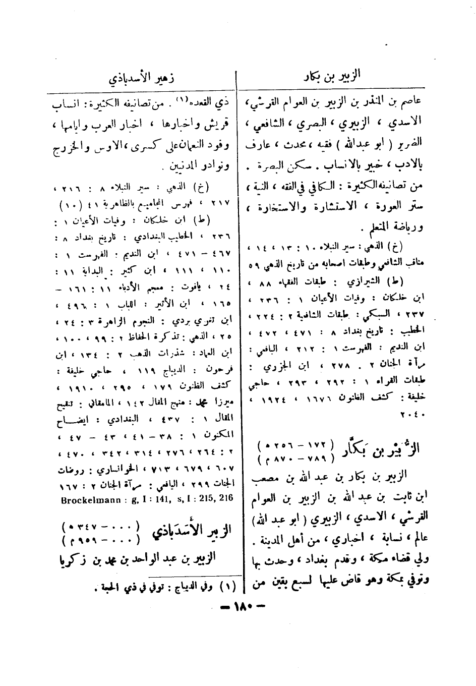 ميرزا محمد: منهج المقال 142، المامقاني: تنقيح المقال 1: 437، البغدادي: ايضاح المكنون 1: 38 - 41، 43 - 47، 2: 264، 276، 314، 342، 470، 607، 679، 713، الخوانساري: روضات الجنات 299، اليافعي: مرآة الجنان 2: 167 216 , 215: Brockelmann: g , I: 141 , s , I الزبير الاسدباذي (000 - 347 هـ) (000 - 959 م) الزبير بن عبد الواحد بن محمد بن زكريا