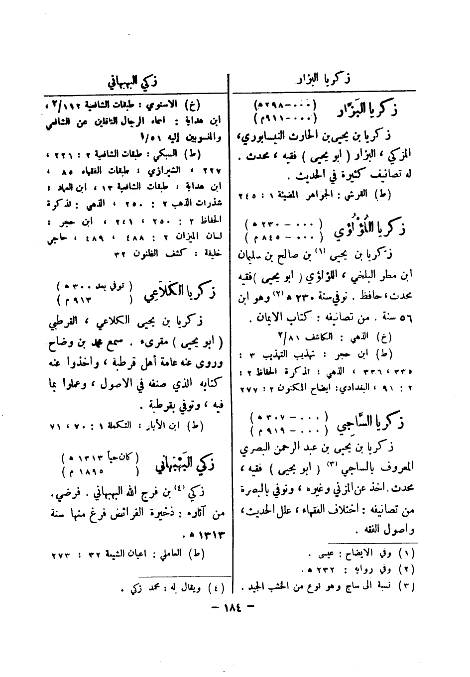 (خ) الذهبي: الكاشف 81 / 2 (ط) ابن حجر: تهذيب التهذيب 3: 335، 336، الذهبي: تذكرة الحفاظ 2: 2: 91، البغدادي: ايضاح المكنون 2: 277 زكريا الساجي (000 - 307 هـ) (000 - 919 م) زكريا بن يحيى بن عبد الرحمن البصري المعروف بالساجي (3) (أبو يحيى) فقيه، محدث اخذ عن المزني وغيره، وتوفي بالبصرة من تصانيفه: اختلاف الفقهاء، علل الحديث، واصول الفقه.