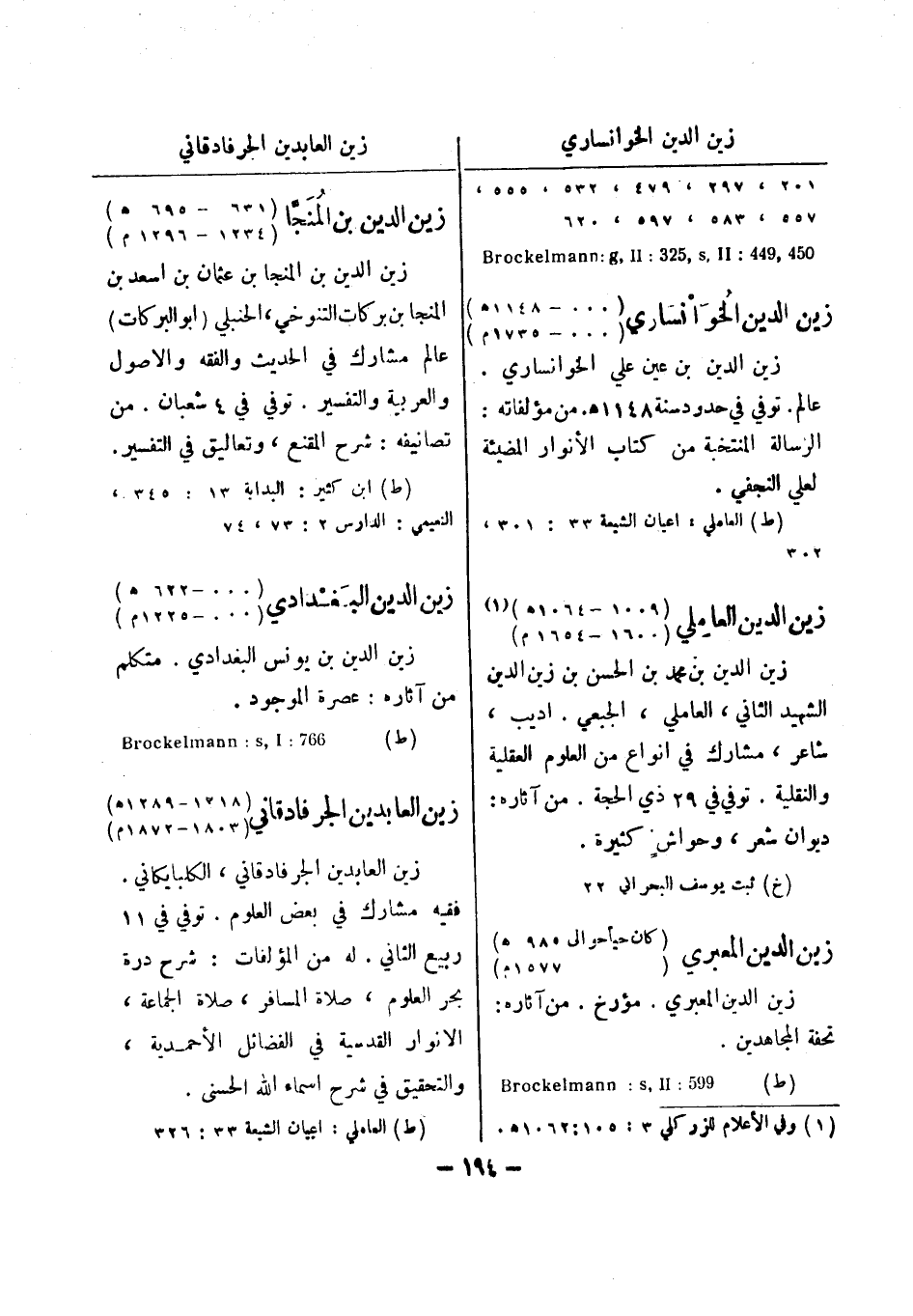 450 , 449: Brockelmann: g , II: 523 , s , II زين الدين الخوانساري (000 - 1148 هـ) (000 - 1735 م) زين الدين بن عين علي الخوانساري.