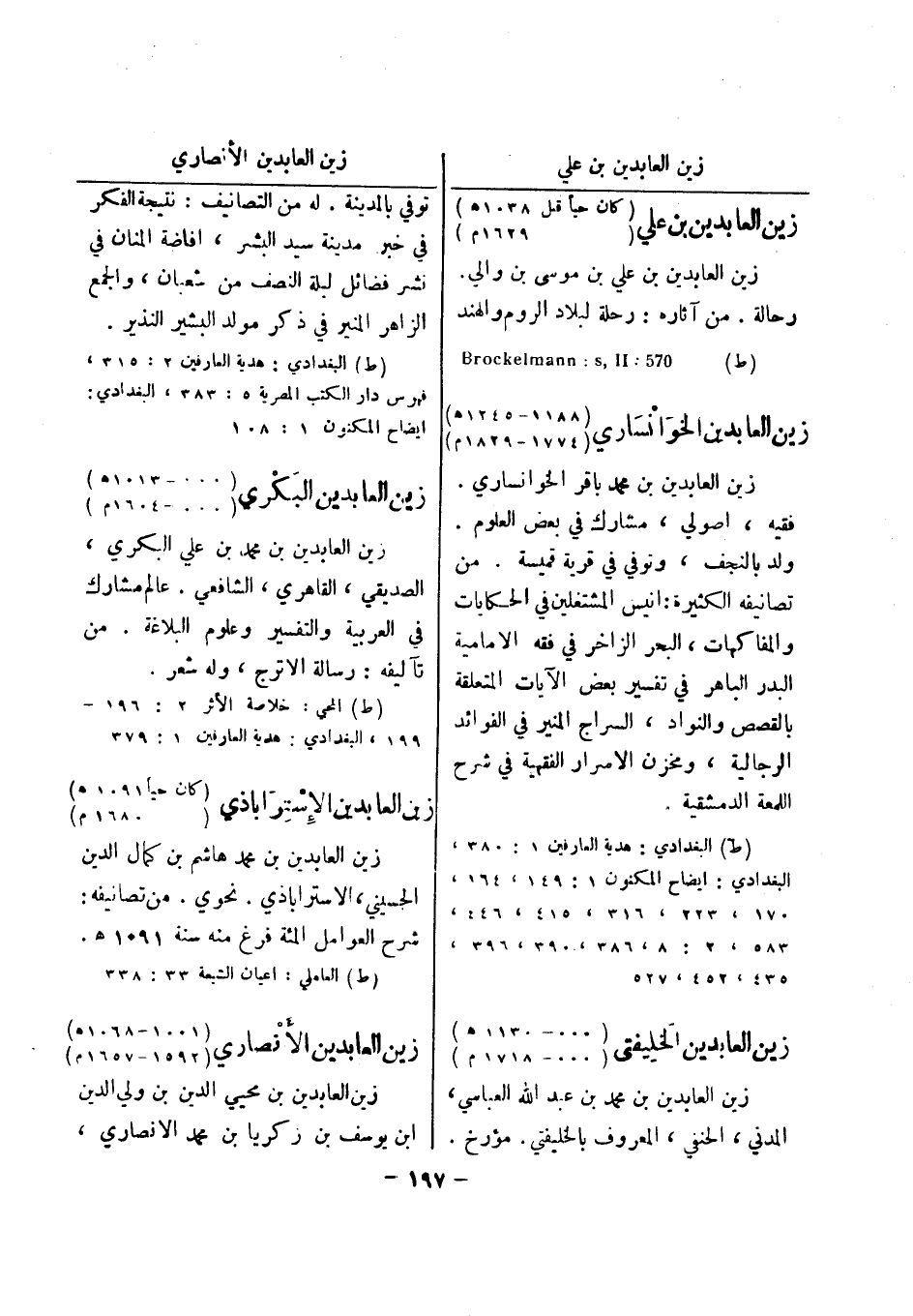 (ط) العاملي: اعيان الشيعة 33: 338 زين العابدين الانصاري (1001 - 1068 هـ) (1592 - 1657 م) زين العابدين بن محيي الدين بن ولي الدين ابن يوسف بن زكريا بن محمد الانصاري،