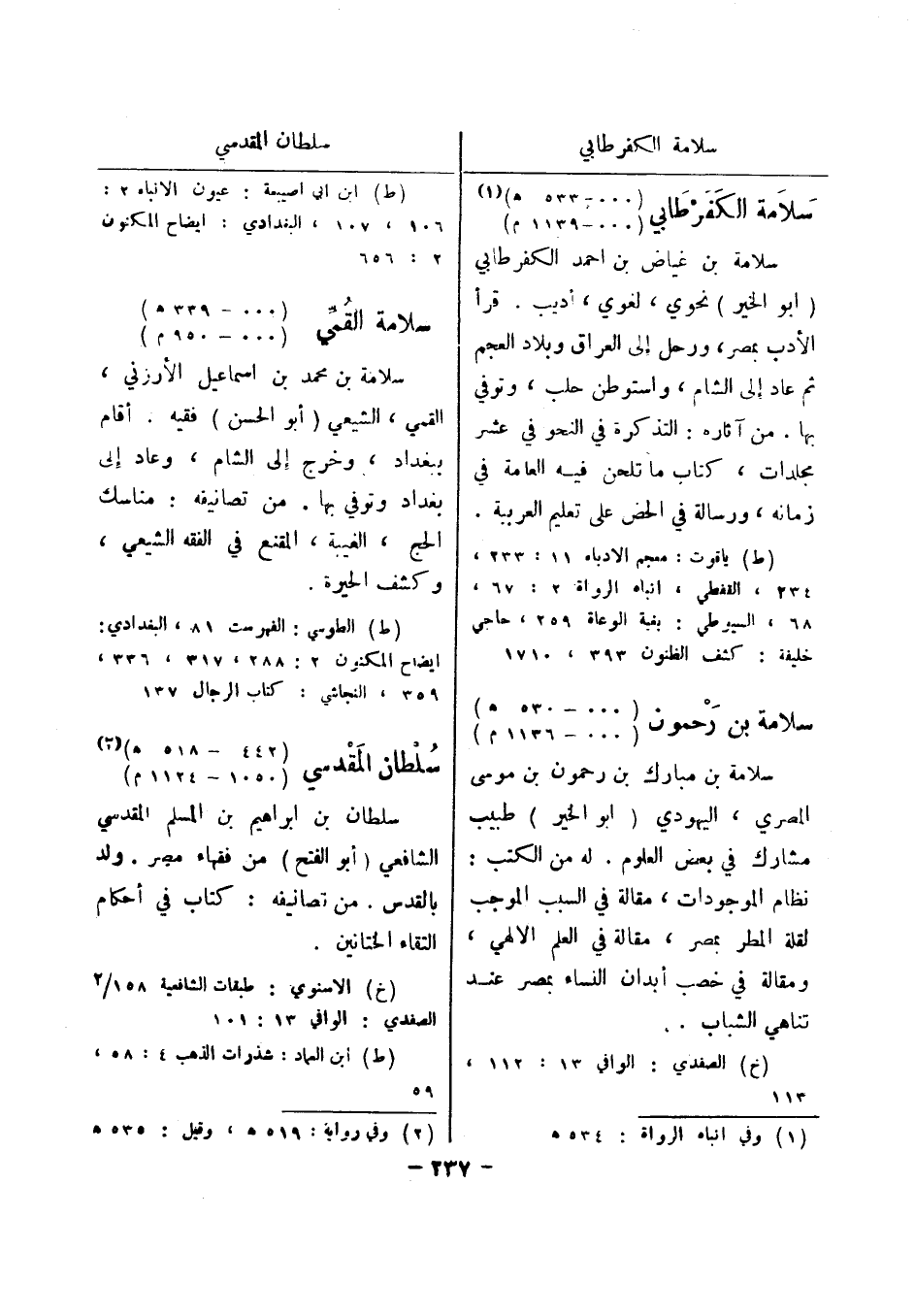 (ط) الطوسي: الفهرست 81، البغدادي: ايضاح المكنون 2: 288، 317، 336، 359، النجاشي: كتاب الرجال 137 سلطان المقدسي (442 - 518 هـ) (2) (1050 - 1124 م) سلطان بن ابراهيم بن المسلم المقدسي الشافعي (أبو الفتح) من فقهاء مصر.