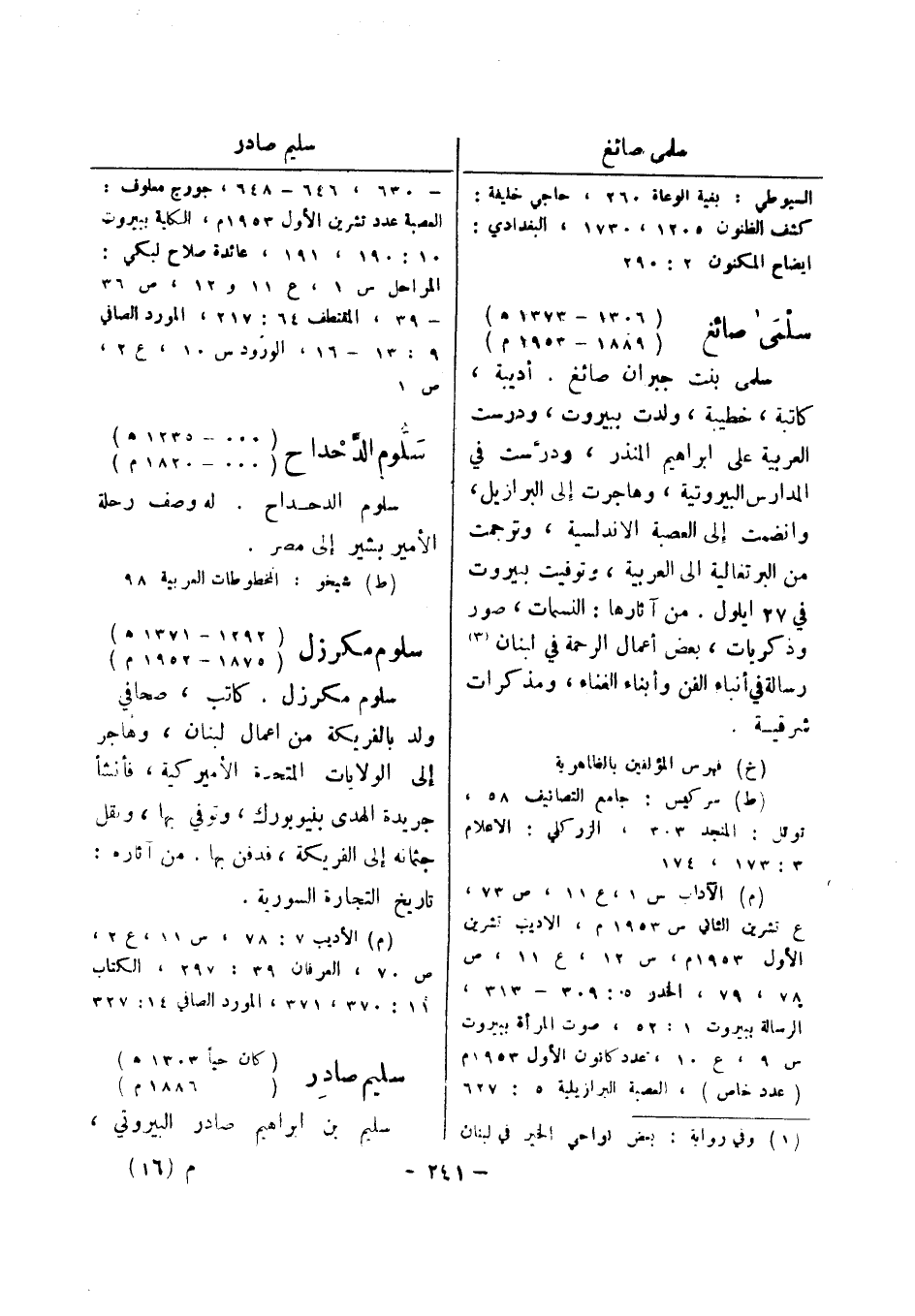 السيوطي: بغية الوعاة 260، حاجي خليفة: كشف الظنون 1205، 1730، البغدادي: ايضاح المكنون 2: 290 سلمى صائغ (1306 - 1373 هـ) (1889 - 1953 م)
