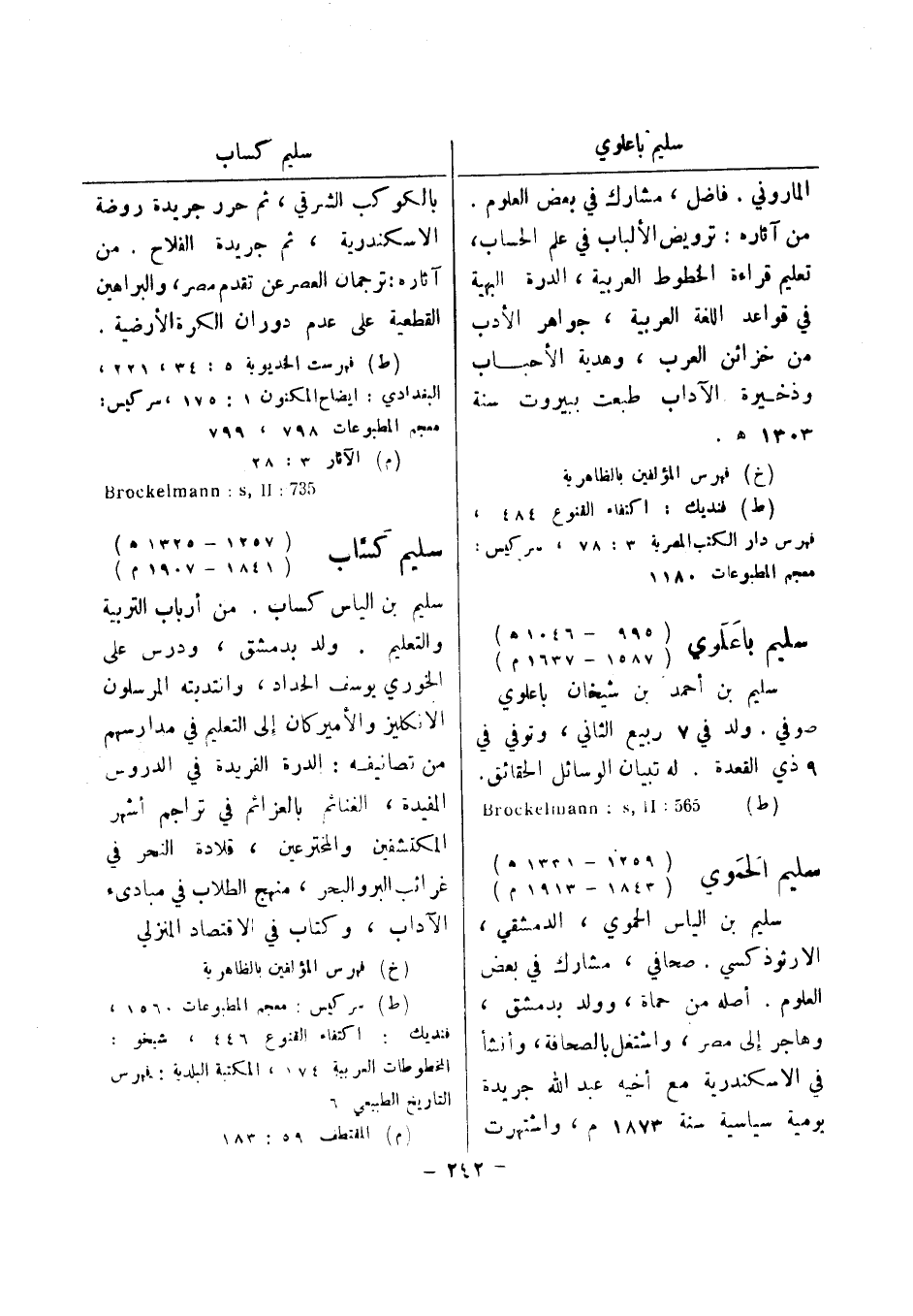 (ط) فهرست الخديوية 5: 34، 221، البغدادي: ايضاح المكنون 1: 175، سركيس: معجم المطبوعات 798، 799 (م) الآثار 3: 28 735: Brockelmann: s , II سليم كساب (1257 - 1325 هـ) (1841 - 1907 م) سليم بن الياس كساب.