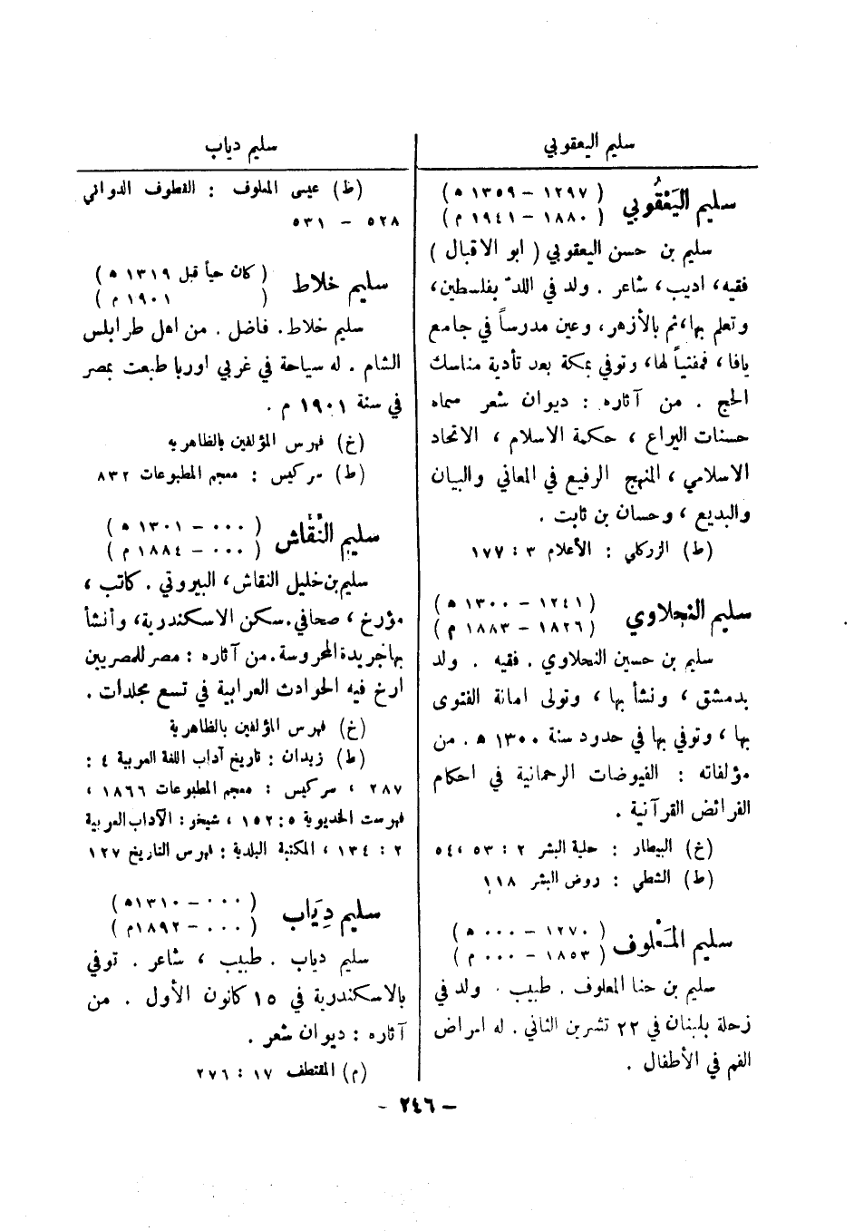 (خ) فهرس المؤلفين بالظاهرية (ط) سركيس: معجم المطبوعات 832 سليم النقاش (000 - 1301 هـ) (1884 000 م) سليم بن خليل النقاش، البيروتي.