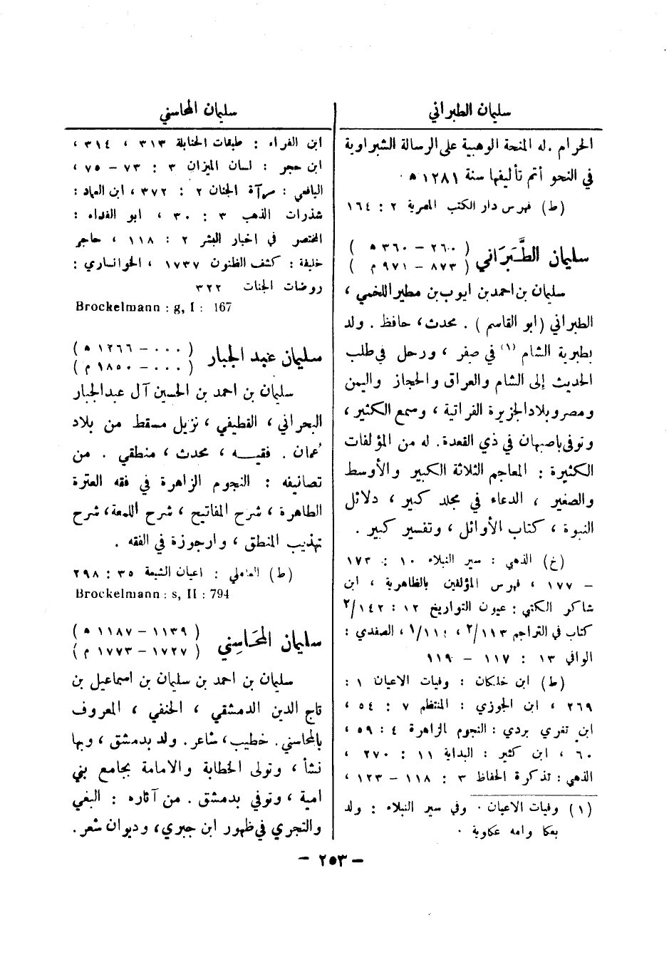 (ط) العاملي: اعيان الشيعة 35: 298 794: Brockelmann: s , II سليمان المحاسني (1139 - 1187 هـ) (1727 - 1773 م) سليمان بن احمد بن سليمان بن اسماعيل بن تاج الدين الدمشقي، الحنفي، المعروف بالمحاسني.