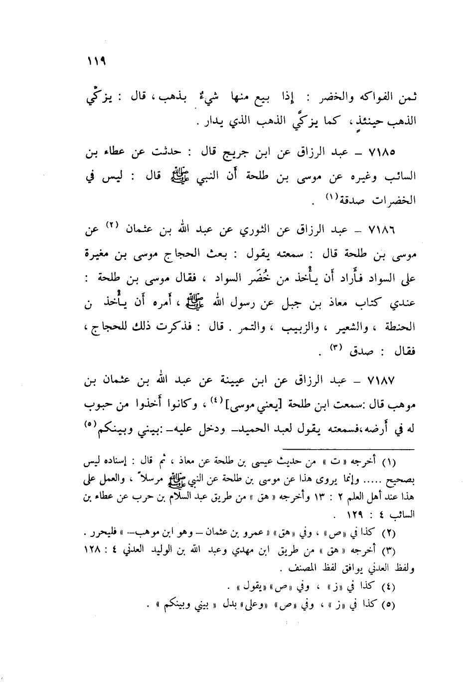 ٧١٨٧ - عَنِ ابْنِ عُيَيْنَةَ، عَنْ عَبْدِ اللَّهِ بْنِ عُثْمَانَ بْنِ مَوْهِبٍ قَالَ: سَمِعْتُ ابْنَ طَلْحَةَ يَعْنِي مُوسَى، وَكَانُوا أَخَذُوا مِنْ حُبُوبٍ لَهُ فِي أَرْضِهِ فَسَمِعْتُهُ يَقُولُ لِعَبْدِ الْحَمِيدِ وَدَخَلَ عَلَيْهِ: بَيْنِي، وَبَيْنَكُمْ كِتَابُ مُعَاذِ بْنِ جَبَلٍ: «لَمْ يَأْخُذْ مِنَ الْخُضَرِ شَيْئًا»