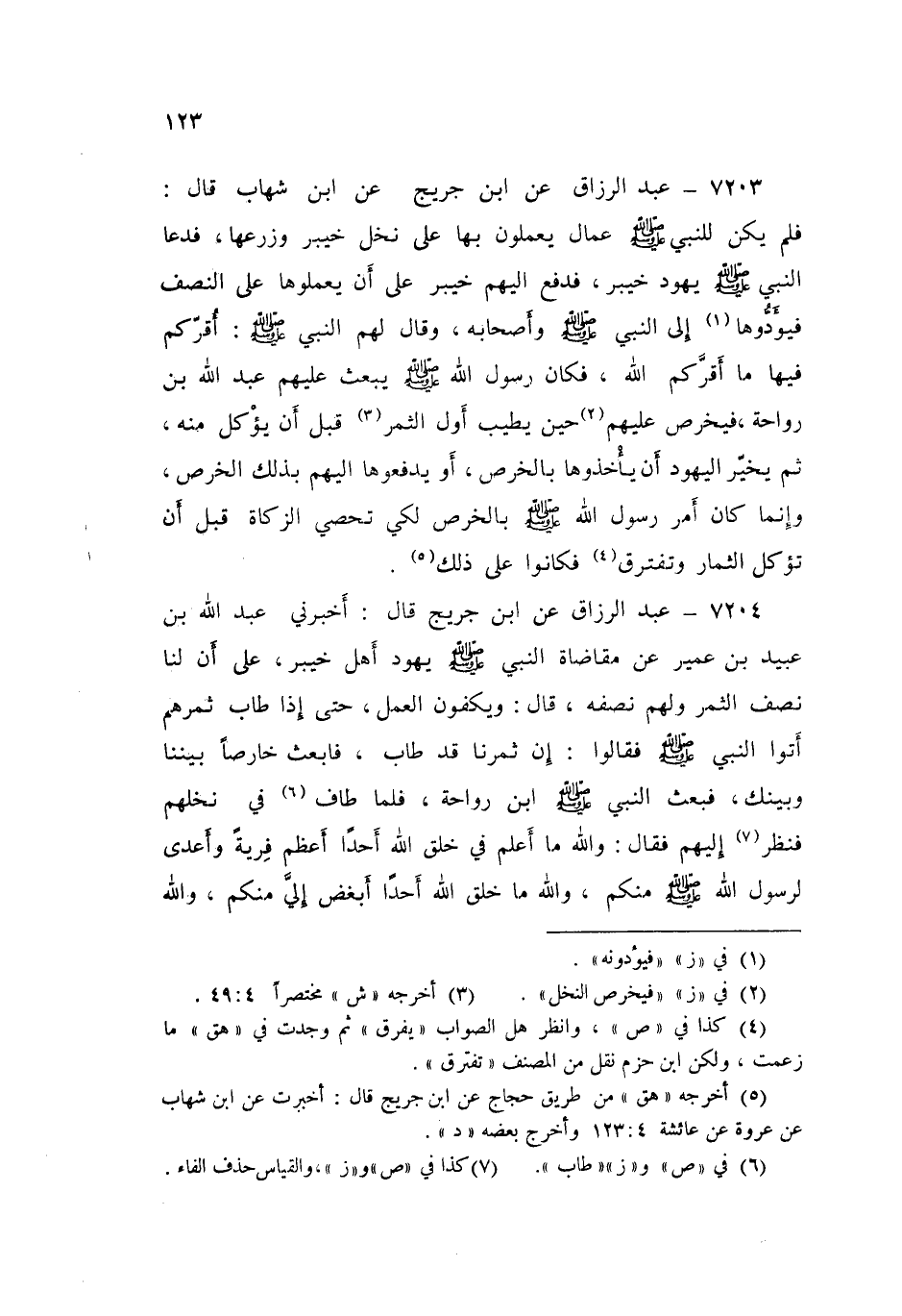 ٧٢٠٤ - عَنِ ابْنِ جُرَيْجٍ قَالَ: أَخْبَرَنِي عَبْدُ اللَّهِ بْنُ عُبَيْدِ بْنِ عُمَيْرٍ، عَنْ مُقَاضَاةِ النَّبِيِّ صَلَّى اللهُ عَلَيْهِ وَسَلَّمَ يَهُودَ أَهْلِ خَيْبَرَ عَلَى أَنَّ لَنَا نِصْفُ الثَّمَرِ، وَلَهُمْ نِصْفُهُ قَالَ: وَيَكْفُونَ الْعَمَلَ حَتَّى إِذَا طَابَ ثَمَرُهُمْ أَتَوُا النَّبِيَّ صَلَّى اللهُ عَلَيْهِ وَسَلَّمَ فَقَالُوا: إِنَّ ثَمَرَنَا قَدْ طَابَ فَابْعَثْ خَارِصًا بَيْنَنَا وَبَيْنَكَ «فَبَعَثَ النَّبِيُّ صَلَّى اللهُ عَلَيْهِ وَسَلَّمَ ابْنَ رَوَاحَةَ»، فَلَمَّا طَافَ فِي نَخْلِهِمْ، فَنَظَرَ إِلَيْهِمْ فَقَالَ: «وَاللَّهِ مَا أَعْلَمُ فِي خَلْقِ اللَّهِ أَحَدًا أَعْظَمَ فِرْيَةً، وَأَعْدَى لِرَسُولِ اللَّهِ صَلَّى اللهُ عَلَيْهِ وَسَلَّمَ مِنْكُمْ، وَاللَّهِ مَا خَلَقَ اللَّهُ أَحَدًا أَبْغَضَ إِلِيَّ مِنْكُمْ، وَاللَّهِ ⦗١٢٤⦘ مَا يَحْمِلُنِي ذَلِكَ عَلَى أَنْ أَحِيفَ عَلَيْكُمْ قَدْرَ مِثْقَالِ ذَرَّةٍ، وَأَنَا أَعْلَمُهَا» قَالَ: «ثُمَّ خَرَصَهَا جَمِيعًا الَّذِي لَهُمْ، وَالَّذِي لِلْيَهُودِ ثَمَانِينَ أَلْفَ وَسَقٍ»، ثُمَّ قَالَتِ الْيَهُودُ: حَرَبْتَنَا فَقَالَ ابْنُ رَوَاحَةَ: «إِنَّ شِئْتُمْ، فَأَعْطُونَا أَرْبَعِينَ أَلْفَ وَسَقْ، وَنُخْرِجُ عَنْكُمْ وإِنْ شِئْتُمْ أَعْطَيْنَاكُمْ أَرْبَعِينَ أَلْفَ وَسَقٍ، وَتَخْرُجُونَ عَنَّا» فَنَظَرَ بَعْضُهُمْ إِلَى بَعْضٍ فَقَالُوا: بِهَذَا قَامَتِ السَّمَوَاتُ، وَالْأَ رْضُ، وَبِهَذَا يَغْلِبُونَكُمْ