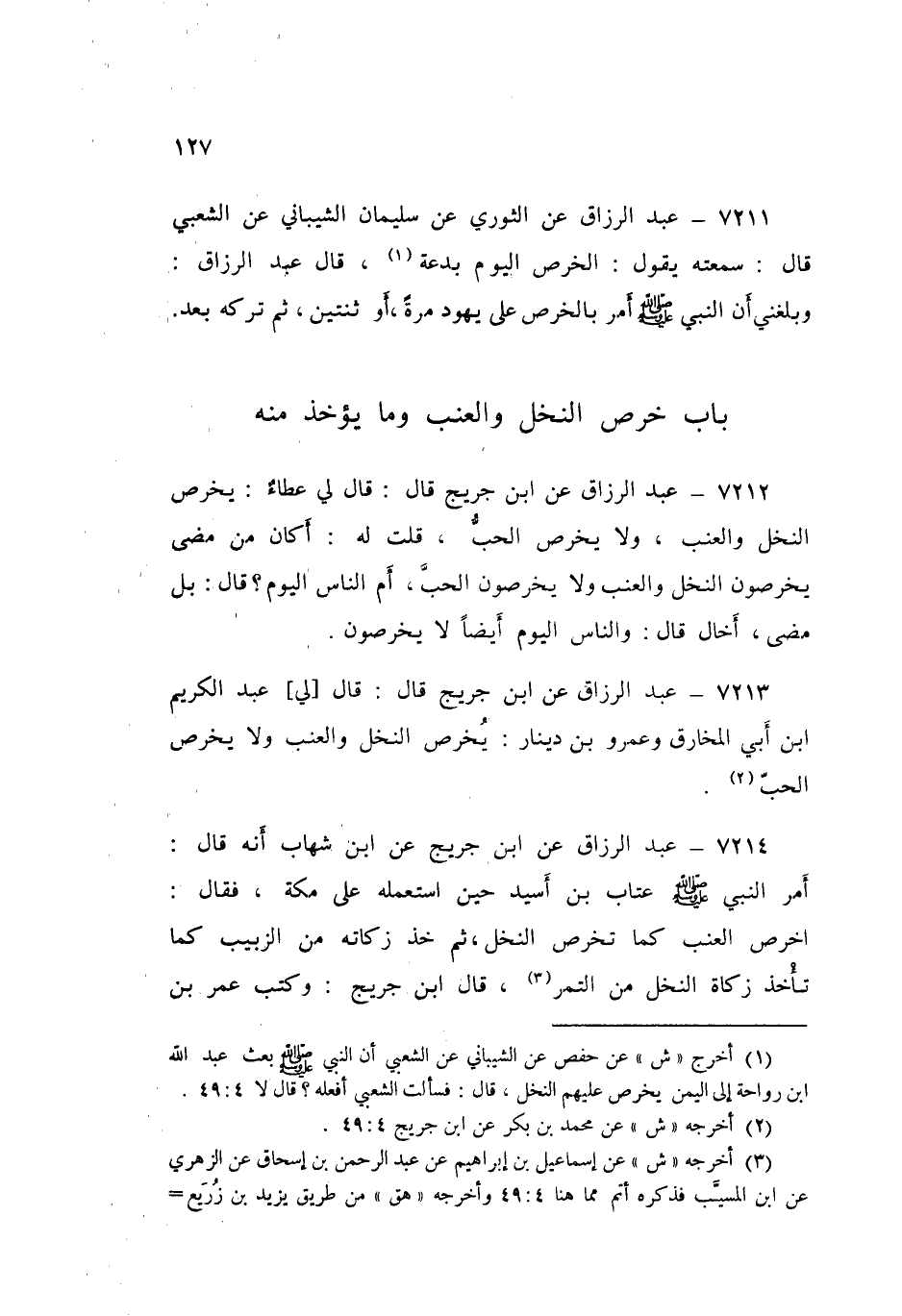 ٧٢١٢ - عَنِ ابْنِ جُرَيْجٍ قَالَ: قَالَ لِي عَطَاءٌ: «يُخْرَصُ النَّخْلُ، وَالْعِنَبُ، وَلَا يُخْرَصُ الْحَبُّ»، قُلْتُ لَهُ: أَكَانَ مَنْ مَضَى يُخْرِصُونَ النَّخْلَ، وَالْعِنَبَ، وَلَا يُخْرِصُونَ الْحَبَّ أَمِ النَّاسُ الِيَوْمَ؟ قَالَ: " بَلْ مَضَى، إِخَالُ قَالَ: وَالنَّاسُ الِيَوْمَ أَيْضًا لَا يُخْرِصُونَ "