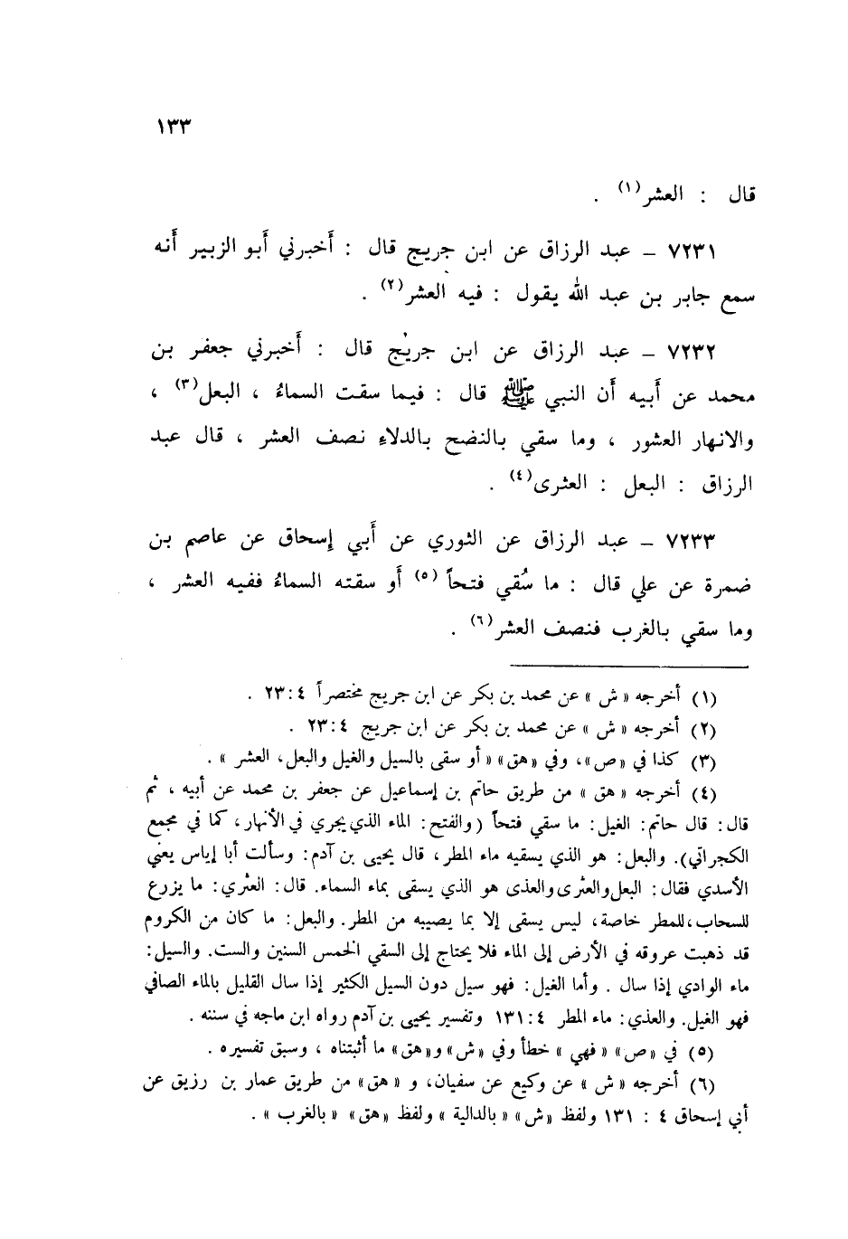 ٧٢٣٢ - عَنِ ابْنِ جُرَيْجٍ قَالَ: أَخْبَرَنِي جَعْفَرُ بْنُ مُحَمَّدٍ، عَنْ أَبِيهِ، أَنَّ النَّبِيَّ صَلَّى اللهُ عَلَيْهِ وَسَلَّمَ قَالَ: «فِيمَا سَقَتِ السَّمَاءُ، الْبَعْلُ وَالْأَنْهَارُ وَالْعُشُورُ، وَمَا سُقِيَ بِالنَّضْحِ بَالدِّلَاءِ نِصْفُ الْعُشْرِ»، قَالَ عَبْدُ الرَّزَّاقِ: " الْبَعْلُ: الْعَثْرَى "