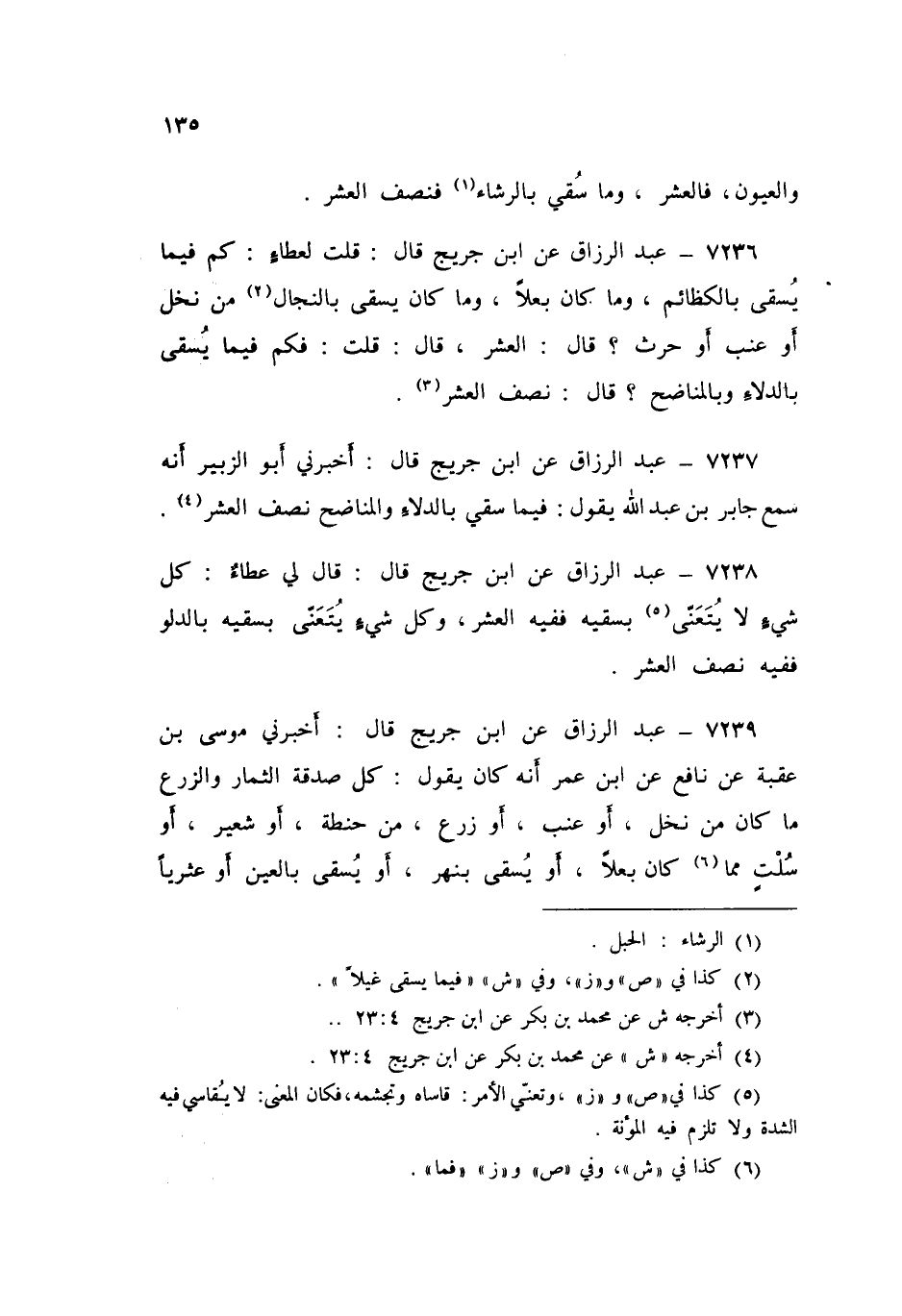 ٧٢٣٧ - عَنِ ابْنِ جُرَيْجٍ قَالَ: أَخْبَرَنِي أَبُو الزُّبَيْرِ، أَنَّهُ سَمِعَ جَابِرَ بْنَ عَبْدِ اللَّهِ يَقُولُ: «فِيمَا سُقِيَ بِالدِّلَاءِ، وَالْمَنَاضِحِ نِصْفُ الْعُشْرِ»
