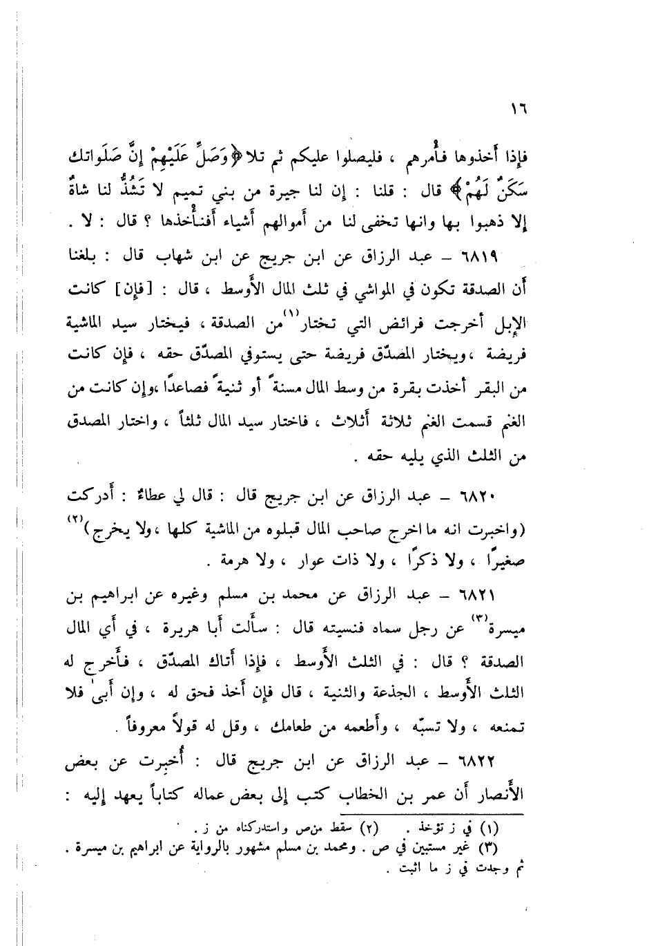 ٦٨٢٢ - عَنِ ابْنِ جُرَيْجٍ قَالَ: أُخْبِرْتُ عَنْ بَعْضِ الْأَنْصَارِ، أَنَّ عُمَرَ بْنَ الْخَطَّابِ كَتَبَ إِلَى بَعْضِ عُمَّالِهِ كِتَابًا يَعْهَدُ إِلَيْهِ ⦗١٧⦘: «خُذِ الصَّدَقَةَ مِنَ الْمُسْلِمِينَ طُهْرَةً لِأَعْمَالِهِمْ، وَزَكَاةً لِأَمْوَالِهِمْ، وَحُكْمًا مِنْ أَحْكَامِ اللَّهِ، الْعَدَاءُ فِيهَا حَيْفٌ، وَظُلْمٌ لِلْمُسْلِمِينَ، وَالتَّقْصِيرُ عَنْهَا مُدَاهَنَةٌ فِي الْحَقِّ، وَخِيَانَةٌ لِلْأَمَانَةِ، فَادْعُ النَّاسَ بِأَمْوَالِهِمْ إِلَى أَرْفَقِ الْمَجَامِعِ، وَأَقْرَبِهَا إِلَى مَصَالِحِهِمْ، وَلَا تَحْبِسِ النَّاسَ أَوَّلَهُمْ لِآخِرِهِمْ، فَإِنَّ الرَّجَزَ لِلْمَاشَيَةِ عَلَيْهَا شَدِيدَةٌ، عَلَيْهَا مَهِلَاتٌ، وَلَا تَسُقْهَا مَسَاقًا يُبْعِدُ بِهَا الْكَلَأُ وَرَدَّهَا فَإِذَا أَوْقَفَ الرَّجُلُ عَلَيْكَ غَنَمَهُ، فَلَا تَعْتَمْ مِنْ غَنَمِهِ، وَلَا تَأْخُذْ مِنْ أَدْنَاهَا، وَخُذِ الصَّدَقَةَ مِنْ أَوْسَطِهَا، وَلَا تَأْخُذْ مِنْ رَجُلٍ إنْ لَمْ تَجِدْ فِي إِبِلِهِ السِّنَّ الَّتِي عَلَيْهِ إِلَا تِلْكَ السَّنَّ مِنْ شَرْوَى إِبِلِهِ، أَوْ قِيمَةَ عَدْلٍ، وَانْظُرْ ذَواتِ الدَّرِّ، وَالْمَاخِضَ مِمَّا تَجِبُ مِنْهُ الصَّدَقَةُ فَتَنَكَّبْ عَنْهَا عَنْ مَصَالِحِ الْمُسْلِمِينَ، فَإِنَّهَا مَالُ حَاضِرِهِمْ، وَزَادُ مُغْرِبِهَمْ، أَوْ مُعِدِّيهِمْ، وَذَخِيرَةُ زَمَانِهِمْ، ثُمَّ اقْسِمْ لِلْفُقَرَاءِ، وَابْدَأْ بِضَعَفَةِ المَسْكَنَةِ، وَالْأَيْتَامِ، وَالْأَرَامِلِ، وَالشُّيُوخِ، فَمَنِ اجْتَمَعَ لَكَ مِنَ الْمَسَاكِينِ فَكَانُوا أَهْلَ بَيْتٍ يَتَعَاقَبُونَ، وَيَتَحَامَلُونَ فَاقْسِمْ لَهُمْ مَا كَانَ مِنَ الْإِبِلِ يَتَعَاقَبُوهُ حَمْلَهُمْ، وَإِنْ كَانَ مِنَ الْغَنَمِ امْنَحْهُمْ، وَمَنْ كَانَ فَذًّا فَلَا تُنْقِصْ كُلَّ خَمْسَةٍ مِنْهُمْ مِنْ فَرَيْضَةٍ أَوْ عَشْرٍ شَيْئًا إِلَى خَمْسَ عَشْرَةَ مِنَ الْغَنَمِ»