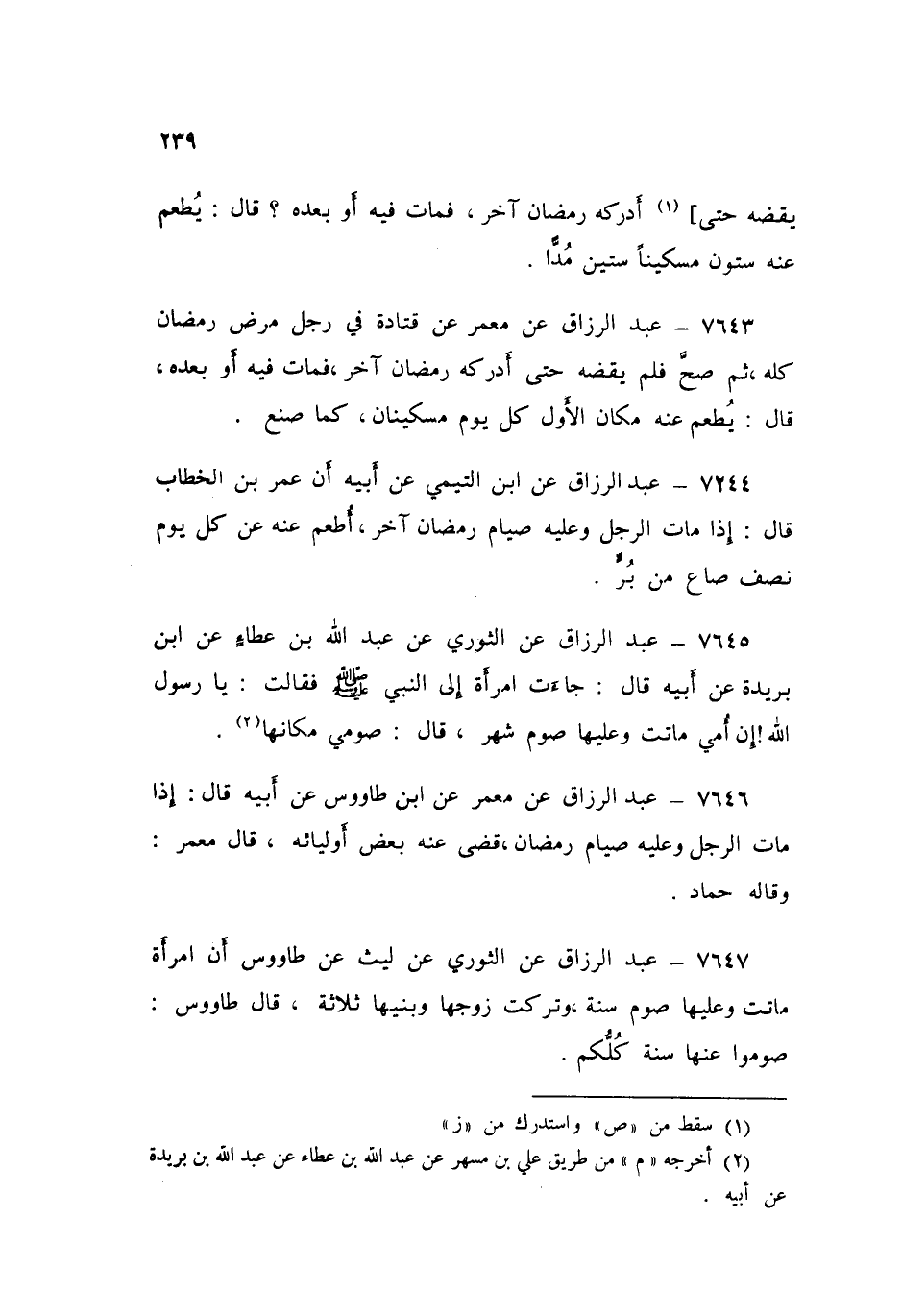 ٧٦٤٦ - عَنْ مَعْمَرٍ، عَنِ ابْنِ طَاوُسٍ، عَنْ أَبِيهِ قَالَ: «إِذَا مَاتَ الرَّجُلُ وَعَلَيْهِ صِيَامُ رَمَضَانَ قَضَى عَنْهُ بَعْضُ أَوْلِيَائُهُ»، قَالَ مَعْمَرٌ: وَقَالَهُ حَمَّادٌ