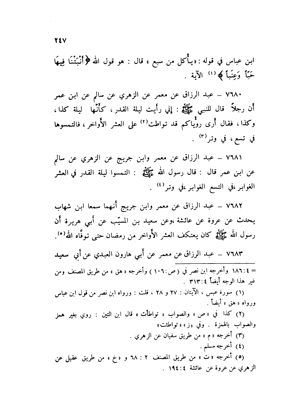 ٧٦٨١ - عَبْدُ الرَّزَّاقِ، عَنْ مَعْمَرٍ، وَابْنِ جُرَيْجٍ، عَنِ الزُّهْرِيِّ، عَنْ سَالِمٍ، عَنِ ابْنِ عُمَرَ قَالَ: قَالَ رَسُولُ اللَّهِ صَلَّى اللهُ عَلَيْهِ وَسَلَّمَ: «الْتَمِسُوَا لَيْلَةَ الْقَدْرِ فِي الْعَشْرِ الْغَوَابِرِ فِي التِّسْعِ الْغَوَابِرِ فِي وَتْرٍ»
