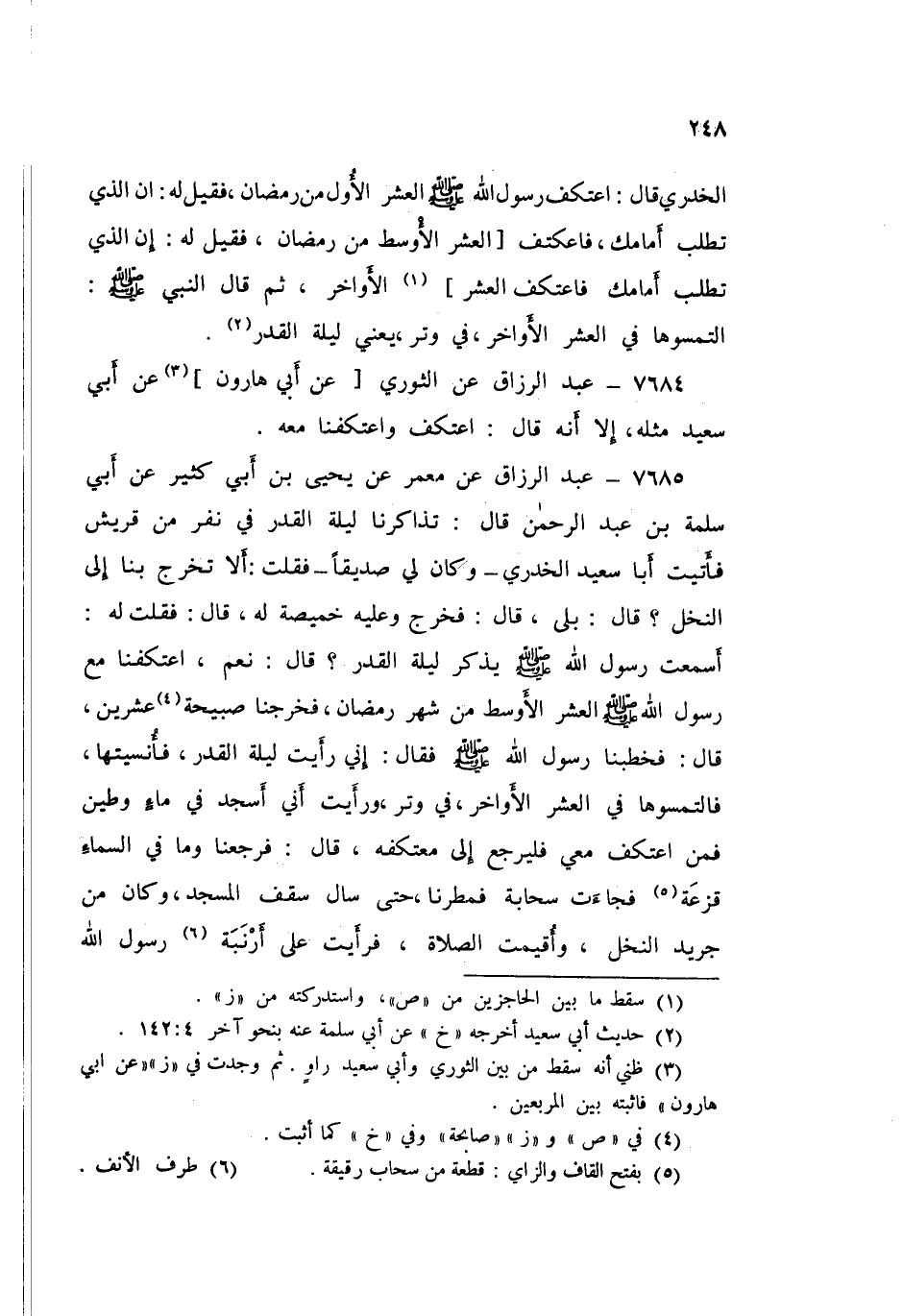 ٧٦٨٥ - عَنْ مَعْمَرٍ، عَنْ يَحْيَى بْنِ أَبِي كَثِيرٍ، عَنْ أَبِي سَلَمَةَ بْنِ عَبْدِ الرَّحْمَنِ قَالَ: تَذَاكَرْنَا لَيْلَةَ الْقَدْرِ فِي نَفَرٍ مِنْ قُرَيْشٍ، فَأَتَيْتُ أَبَا سَعِيدٍ الْخُدْرِيَّ - وَكَانَ لِي صَدِيقًا -، فَقُلْتُ: أَلَا تَخْرُجُ بِنَا إِلَى النَّخْلِ؟ قَالَ: بَلَى قَالَ: فَخَرَجَ، وَعَلَيْهِ خَمِيصَةٌ لَهُ قَالَ: فَقُلْتُ لَهُ: أَسَمِعْتَ رَسُولَ اللَّهِ صَلَّى اللهُ عَلَيْهِ وَسَلَّمَ يَذْكُرُ لَيْلَةَ الْقَدْرِ؟ قَالَ: «نَعَمْ، اعْتَكَفْنَا مَعَ رَسُولِ اللَّهِ صَلَّى اللهُ عَلَيْهِ وَسَلَّمَ الْعَشْرَ الْأَوْسَطَ مِنْ شَهْرِ رَمَضَانَ، فَخَرَجْنَا صَبِيحَةَ عِشْرِينَ» قَالَ: فَخَطَبَنَا رَسُولُ اللَّهِ صَلَّى اللهُ عَلَيْهِ وَسَلَّمَ فَقَالَ: «إِنِّي رَأَيْتُ لَيْلَةَ الْقَدْرِ، فَأُنْسِيتُهَا، فَالْتَمِسُوهَا فِي الْعَشْرِ الْأَوَاخِرِ فِي وَتْرٍ، وَرَأَيْتُ أَنِّي أَسْجُدُ فِي مَاءٍ وَطِينٍ، فَمَنِ اعْتَكَفَ مَعِي، فَلْيَرْجِعْ إِلَى مُعْتَكَفِهِ» قَالَ: فَرَجَعْنَا، وَمَا فِي السَّمَاءِ قَزَعَةُ فَجَاءَتْ سَحَابَةٌ فَمُطِرْنَا حَتَّى سَالَ سَقْفُ الْمَسْجِدِ، وَكَانَ مِنْ جَرِيدِ النَّخْلِ، وَأُقِيمَتِ الصَّلَاةُ، فَرَأَيْتُ عَلَى أَرْنَبَةِ رَسُولِ اللَّهِ صَلَّى اللهُ عَلَيْهِ وَسَلَّمَ ⦗٢٤٩⦘ حِينَ انْصَرَفَ أَثَرَ الطَّيْنِ فِي جَبْهَتِهِ، وَأَرْنَبَتِهِ، يَعْنِي لَيْلَةَ إِحْدَى وَعِشْرِينَ