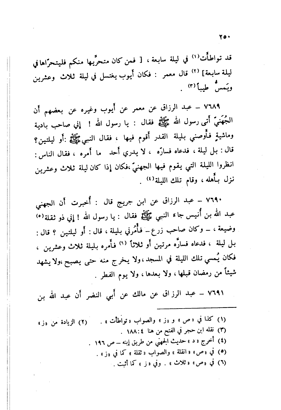 ٧٦٩٠ - عَنِ ابْنِ جُرَيْجٍ قَالَ: أُخْبِرْتُ، أَنَّ الْجُهَنِيَّ عَبْدَ اللَّهِ بْنَ أُنَيْسٍ جَاءَ النَّبِيَّ صَلَّى اللهُ عَلَيْهِ وَسَلَّمَ فَقَالَ: يَا رَسُولَ اللَّهِ إِنِّي ذُو ثِقْلَةٍ وَضَيْعَةٍ - وَكَانَ صَاحِبَ زَرْعٍ - فَأَمَرَنِي بِلَيْلَةٍ قَالَ: «أَوْ لَيْلَتَيْنِ» قَالَ: بَلْ لَيْلَةٌ فَدَعَاهُ فَسَارَّهُ مَرَّتَيْنِ أَوْ ثَلَاثًا، فَأَمَرَهُ بِلَيْلَةِ ثَلَاثٍ وَعِشْرِينَ، فَكَانَ يُمْسِي تِلْكَ اللَّيْلَةَ فِي الْمَسْجِدِ، وَلَا يَخْرُجُ مِنْهُ حَتَّى يُصْبِحَ، وَلَا يَشْهَدُ شَيْئًا مِنْ رَمَضَانَ قَبْلَهَا، وَلَا بَعْدَهَا، وَلَا يَوْمَ الْفِطْرِ