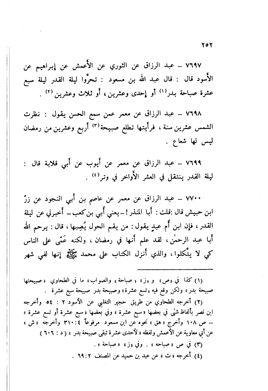 ٧٧٠٠ - عَنْ مَعْمَرٍ، عَنْ عَاصِمِ بْنِ أَبِي النَّجُودِ، عَنْ زِرِّ بْنِ حُبَيْشٍ قَالَ: قُلْتُ: أَبَا الْمُنْذِرِ يَعْنِي أُبَيَّ بْنَ كَعْبٍ، أَخْبَرَنِي عَنْ لَيْلَةِ الْقَدْرِ؛ فَإِنَّ ابْنَ أُمِّ عَبْدٍ يَقُولُ: مَنْ يَقُمِ الْحَوْلَ يُصِبْهَا قَالَ: يَرْحَمُ اللَّهُ أَبَا عَبْدِ الرَّحْمَنِ لَقَدْ عَلِمَ أَنَّهَا فِي رَمَضَانَ، وَلَكِنَّهُ عَمَّى عَلَى النَّاسِ كِي لَا يَتَّكِلُوا، وَالَّذِي أَنْزَلَ الْكِتَابَ عَلَى مُحَمَّدٍ صَلَّى اللهُ عَلَيْهِ وَسَلَّمَ إِنَّهَا لَفِي شَهْرِ ⦗٢٥٣⦘ رَمَضَانَ، وَإِنَّهَا لَيْلَةُ سَبْعٍ وَعِشْرِينَ قَالَ: قُلْتُ أَبَا الْمُنْذِرِ بِمَا عَلِمْتَ ذَلِكَ؟ قَالَ: بِالْآيَةِ الَّذِي أَخْبَرَنَا رَسُولُ اللَّهِ صَلَّى اللهُ عَلَيْهِ وَسَلَّمَ فَقَدْ رَأَيْنَا وَحَفِظْنَا، فَوَاللَّهِ إِنَّهَا لَهِيَ مَا يَسْتَثْنِي قَالَ: - قُلْتُ لِزِرٍّ - وَمَا الْآيَةُ؟ قَالَ: «أَنْ تَطْلُعَ الشَّمْسُ غَدَاتَئِذٍ كَأَنَّهَا طِسْتٌ لَيْسَ لَهَا شُعَاعٌ»