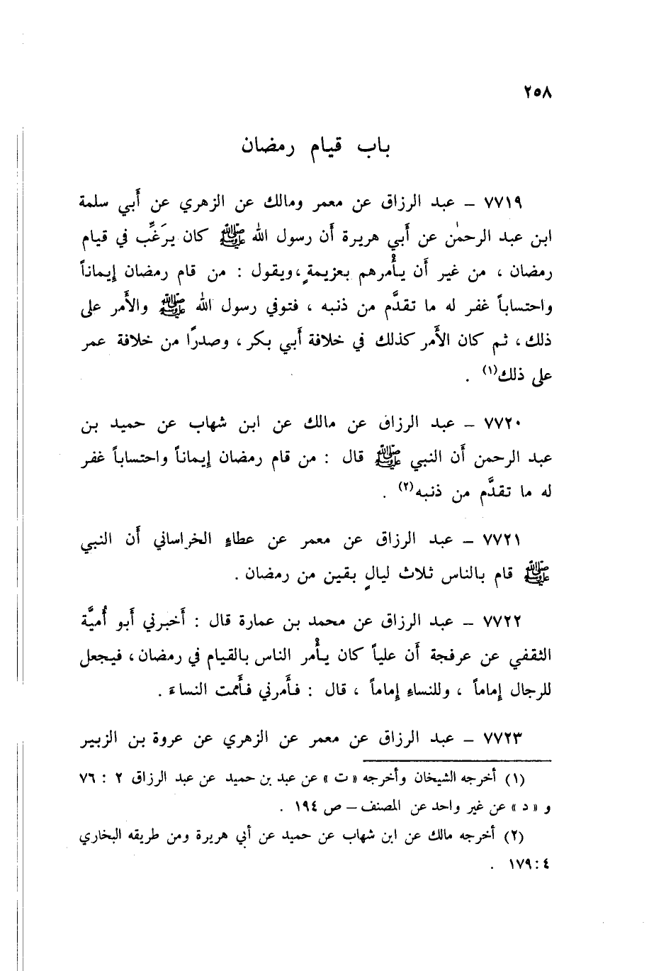 ٧٧١٩ - عَنْ مَعْمَرٍ، وَمَالِكٌ، عَنِ الزُّهْرِيِّ، عَنْ أَبِي سَلَمَةَ بْنِ عَبْدِ الرَّحْمَنِ، عَنْ أَبِي هُرَيْرَةَ، أَنَّ رَسُولَ اللَّهِ صَلَّى اللهُ عَلَيْهِ وَسَلَّمَ كَانَ يُرَغِّبُ فِي قِيَامِ رَمَضَانَ مِنْ غَيْرِ أَنْ يَأْمُرَهُمْ بِعَزِيمَةٍ، وَيَقُولُ: «مَنْ قَامَ رَمَضَانَ إِيمَانًا، وَاحْتِسَابًا غُفِرَ لَهُ مَا تَقَدَّمَ مِنْ ذَنْبِهِ». فَتُوُفِّيَ رَسُولُ اللَّهِ صَلَّى اللهُ عَلَيْهِ وَسَلَّمَ، وَالْأَمْرُ عَلَى ذَلِكَ، ثُمَّ كَانَ الْأَمْرُ كَذَلِكَ فِي خِلَافَةِ أَبِي بَكْرٍ، وَصَدْرًا مِنْ خِلَافَةِ عُمَرَ عَلَى ذَلِكَ
