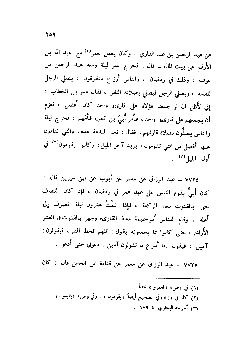 ٧٧٢٤ - عَنْ مَعْمَرٍ، عَنْ أَيُّوبَ، عَنِ ابْنِ سِيرِينَ قَالَ: " كَانَ أُبَيٌّ يَقُومُ لِلنَّاسِ عَلَى عَهْدِ عُمَرَ فِي رَمَضَانَ، فَإِذَا كَانَ النِّصْفُ جَهَرَ بِالْقُنُوتِ بَعْدَ الرَّكْعَةِ، فَإِذَا تَمَّتْ عِشْرُونَ لَيْلَةً انْصَرَفَ إِلَى أَهْلِهِ، وَقَامَ لِلنَّاسِ أَبُو حَلِيمَةَ مُعَاذٌ الْقَارِئُ وَجَهَرَ بِالْقُنُوتِ فِي الْعَشْرِ الْأَوَاخِرِ حَتَّى كَانُوا مِمَّا يَسْمَعُونَهُ يَقُولُ: اللَّهُمَّ قَحَطَ الْمَطَرُ، فَيَقُولُونَ: آمِينَ، فَيَقُولُ: مَا أَسْرَعَ مَا تَقُولُونُ آمِينَ، دَعُونِي حَتَّى أَدْعُوَ "