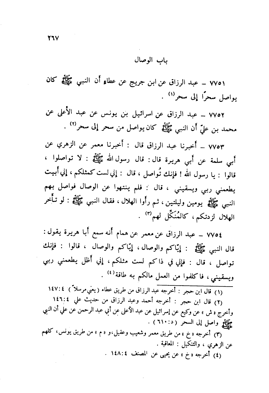٧٧٥١ - عَنِ ابْنِ جُرَيْجٍ، عَنْ عَطَاءٍ، «أَنَّ النَّبِيَّ صَلَّى اللهُ عَلَيْهِ وَسَلَّمَ كَانَ يُوَاصِلُ سَحَرًا إِلَى سَحَرٍ»