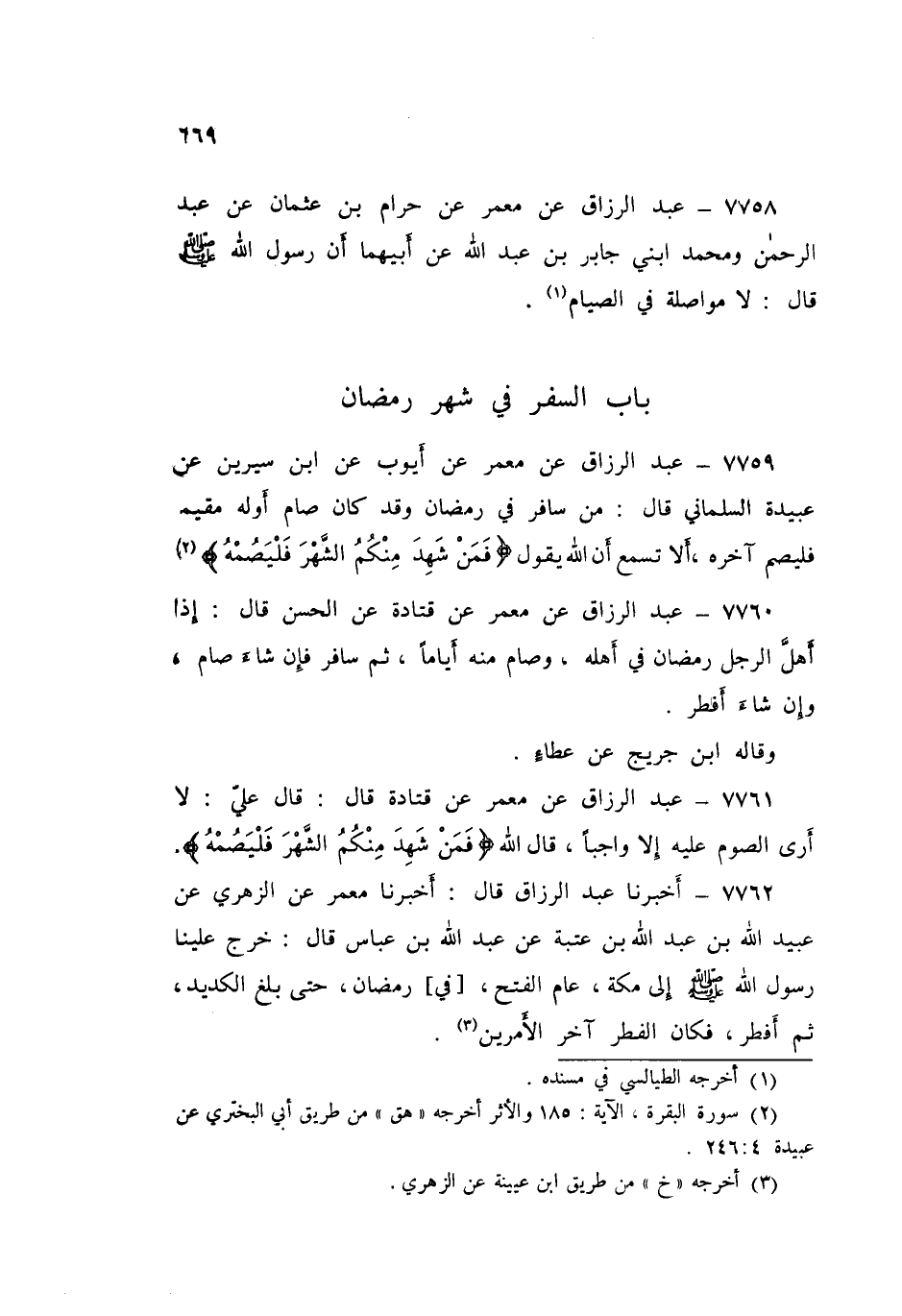 ٧٧٥٩ - عَنْ مَعْمَرٍ، عَنْ أَيُّوبَ، عَنِ ابْنِ سِيرِينَ، عَنْ عَبِيدَةَ السَّلْمَانِيِّ قَالَ: «مَنْ سَافَرَ فِي رَمَضَانَ، وَقَدْ كَانَ صَامَ أَوَّلَهُ مُقِيمًا فَلْيَصُمْ آخِرَهُ»، أَلَا تَسْمَعُ أَنَّ اللَّهَ يَقُولُ: {فَمَنْ شَهِدَ مِنْكُمُ الشَّهْرَ فَلْيَصُمْهُ} [البقرة: ١٨٥]
