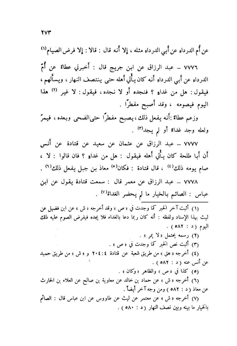 ٧٧٧٧ - عَنْ عُثْمَانَ، عَنْ سَعِيدٍ، عَنْ قَتَادَةَ، عَنْ أَنَسٍ، أَنَّ أَبَا طَلْحَةَ كَانَ يَأْتِي أَهْلَهُ فَيَقُولُ: «هَلْ مِنْ غَدَاءٍ؟»، فَإِنْ قَالُوا: لَا، صَامَ يَوْمَهُ ذَلِكَ قَالَ قَتَادَةُ: «فَكَانَ مُعَاذُ بْنُ جَبَلٍ يَفْعَلُ ذَلِكَ»