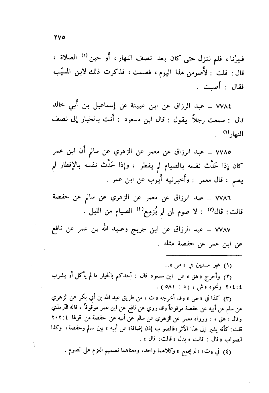 ٧٧٨٦ - عَنْ مَعْمَرٍ، عَنِ الزُّهْرِيِّ، عَنْ سَالِمٍ، عَنْ حَفْصَةَ قَالَتْ: قَالَ: «لَا صَوْمَ لِمَنْ لَمْ يُزْمِعِ الصِّيَامَ مِنَ اللَّيْلِ» عَبْدُ الرَّزَّاقِ،