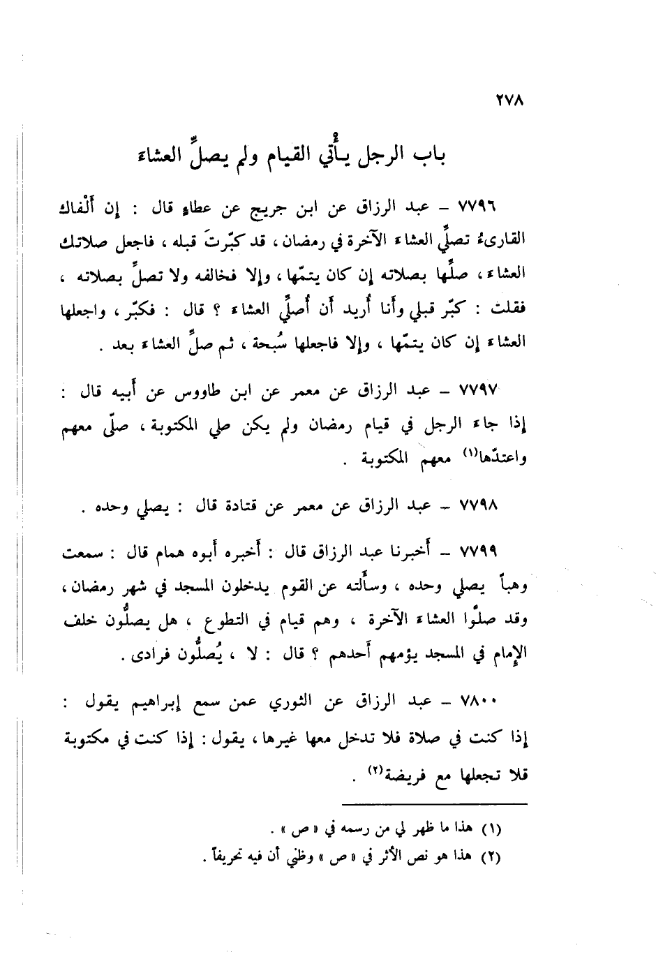 ٧٧٩٩ - عَبْدُ الرَّزَّاقِ قَالَ: أَخْبَرَهُ أَبُوهُ هَمَّامٌ قَالَ: سَمِعْتُ وَهْبًا يُصَلِّي وَحْدَهُ، وَسَأَلْتُهُ عَنِ الْقَوْمِ يَدْخُلُونَ الْمَسْجِدَ فِي شَهْرِ رَمَضَانَ، وَقَدْ صَلَّوُا الْعِشَاءَ الْآخِرَةَ، وَهُمْ قِيَامٌ فِي التَّطَوُّعِ، هَلْ يُصَلُّونَ خَلْفَ الْإِمَامِ فِي الْمَسْجِدِ يَؤُمُّهُمْ أَحَدُهُمْ؟ قَالَ: «لَا، يُصَلُّونَ فُرَادَى»
