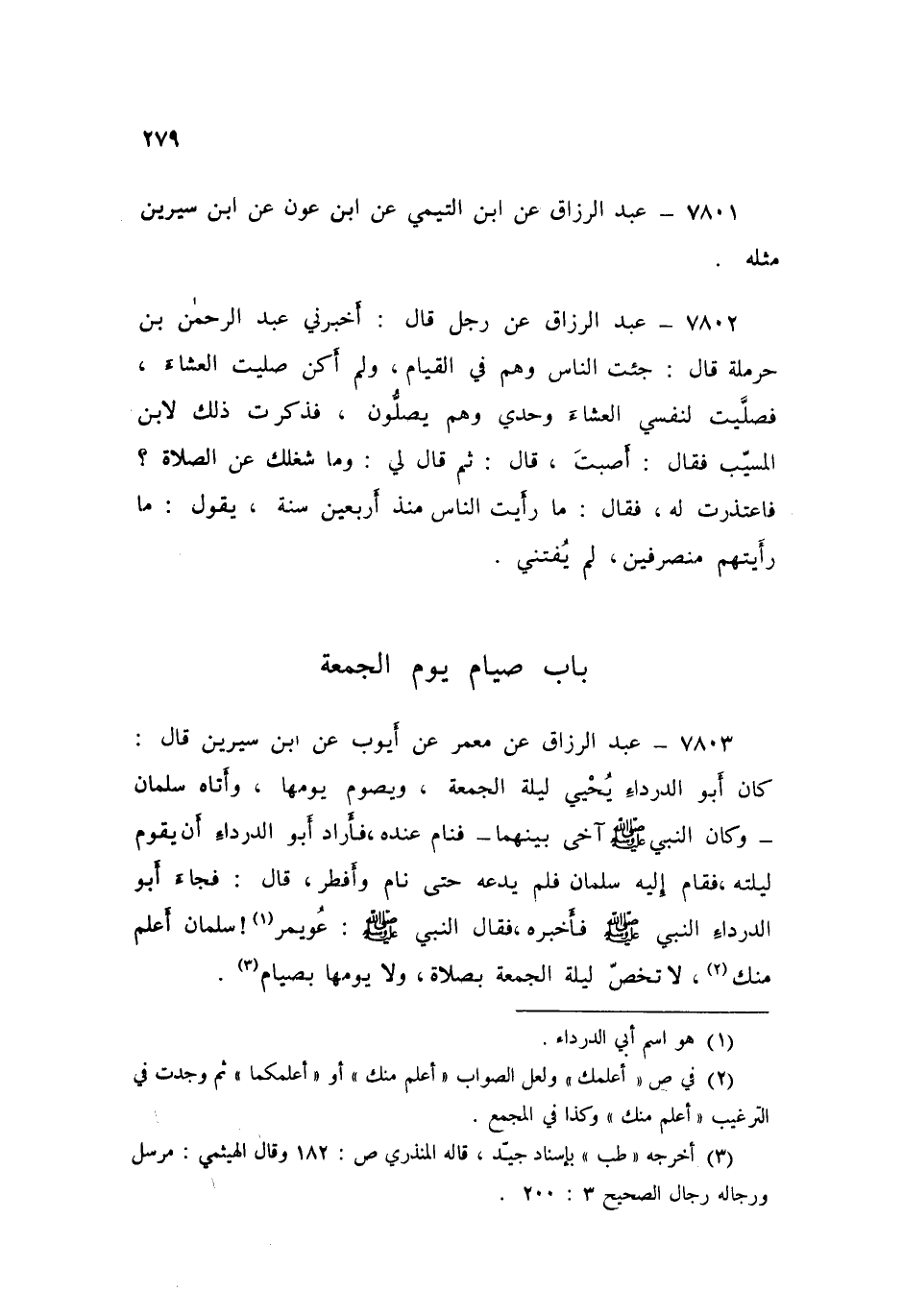 ٧٨٠٣ - عَنْ مَعْمَرٍ، عَنْ أَيُّوبَ، عَنِ ابْنِ سِيرِينَ قَالَ: كَانَ أَبُو الدَّرْدَاءِ يُحْيِي لَيْلَةَ الْجُمُعَةِ، ويَصُومُ يَوْمَهَا، وَأَتَاهُ سَلْمَانُ، وَكَانَ النَّبِيُّ صَلَّى اللهُ عَلَيْهِ وَسَلَّمَ آخَى بَيْنَهُمَا، فَنَامَ عِنْدَهُ، فَأَرَادَ أَبُو الدَّرْدَاءِ أَنْ يَقُومُ لَيْلَتَهُ، فَقَامَ إِلَيْهِ سَلْمَانُ، فَلَمْ يَدَعَهُ حَتَّى نَامَ وَأَفْطَرَ قَالَ: فَجَاءَ أَبُو الدَّرْدَاءِ النَّبِيَّ صَلَّى اللهُ عَلَيْهِ وَسَلَّمَ فَأَخْبَرَهُ، فَقَالَ النَّبِيُّ صَلَّى اللهُ عَلَيْهِ وَسَلَّمَ: «عُوَيْمِرُ سَلْمَانُ أَعْلَمُ مِنْكَ لَا تَخُصَّ لَيْلَةَ الْجُمُعَةِ بِصَلَاةٍ، وَلَا يَوْمَهَا بِصِيَامٍ»