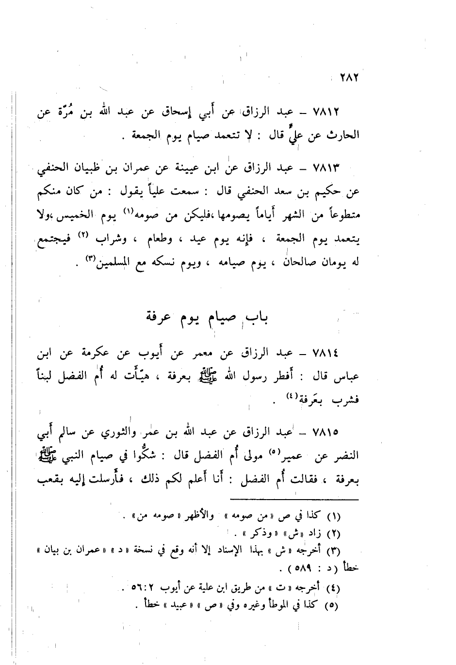 ٧٨١٦ - عَبْدُ الرَّزَّاقِ قَالَ: أَخْبَرَنَا مَعْمَرٌ، عَنْ أَيُّوبَ، عَنْ سَعِيدِ بْنِ جُبَيْرٍ، أَنَّهُ: رَأَى ابْنَ عَبَّاسٍ مُفْطِرًا بِعَرَفَةَ يَأْكُلُ رُمَّانًا "