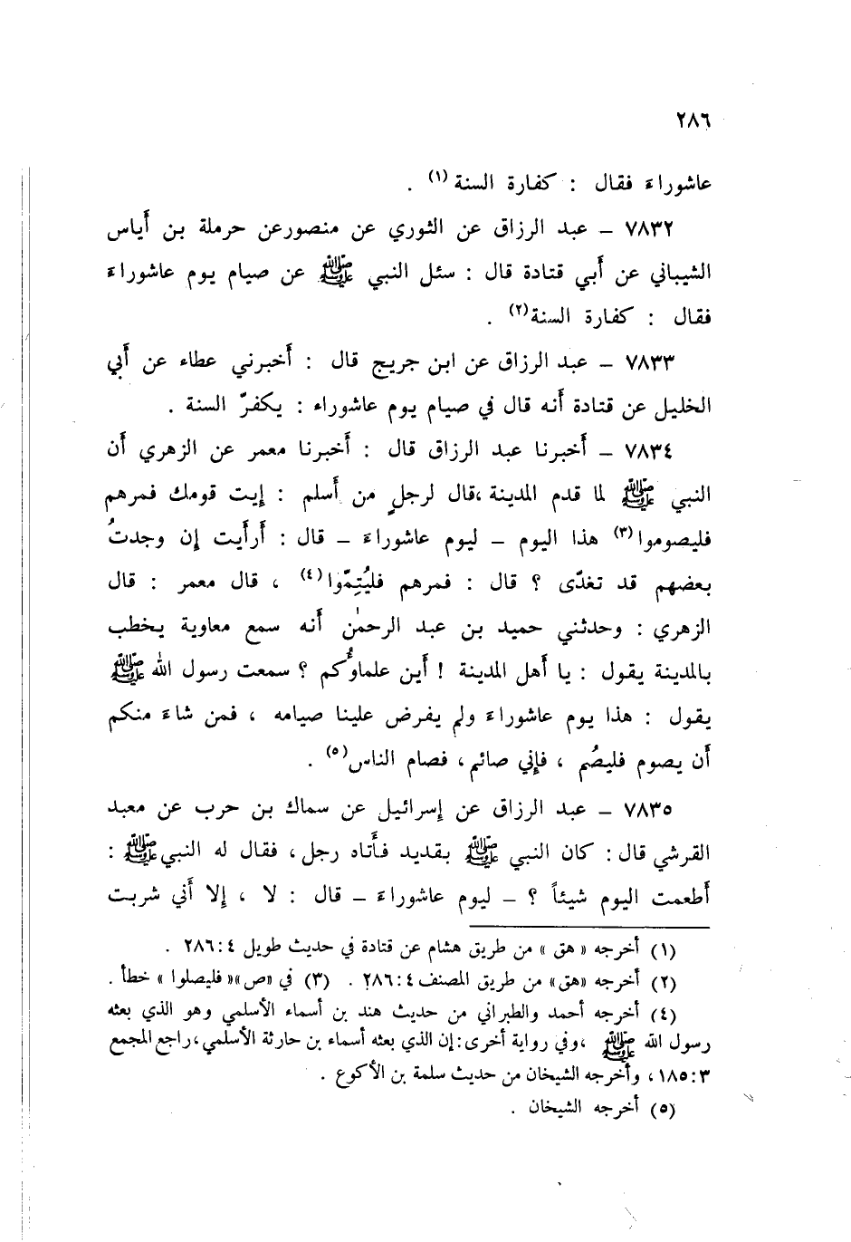 ٧٨٣٤ - عَبْدِ الرَّزَّاقِ قَالَ: أَخْبَرَنَا مَعْمَرٌ، عَنِ الزُّهْرِيِّ، أَنَّ النَّبِيَّ صَلَّى اللهُ عَلَيْهِ وَسَلَّمَ لَمَّا قَدِمَ الْمَدِينَةَ، قَالَ لِرَجُلٍ مِنْ أَسْلَمَ: «إِيتِ قَوْمَكَ فَمُرْهُمْ فَلْيَصُومُوا هَذَا الْيَوْمَ، لِيَوْمِ عَاشُورَاءَ» قَالَ: أَرَأَيْتَ إِنْ وَجَدْتُ بَعْضَهُمْ قَدْ تَغَدَّى؟ قَالَ: «فَمُرْهُمْ فَلْيُتِمُّوا»
