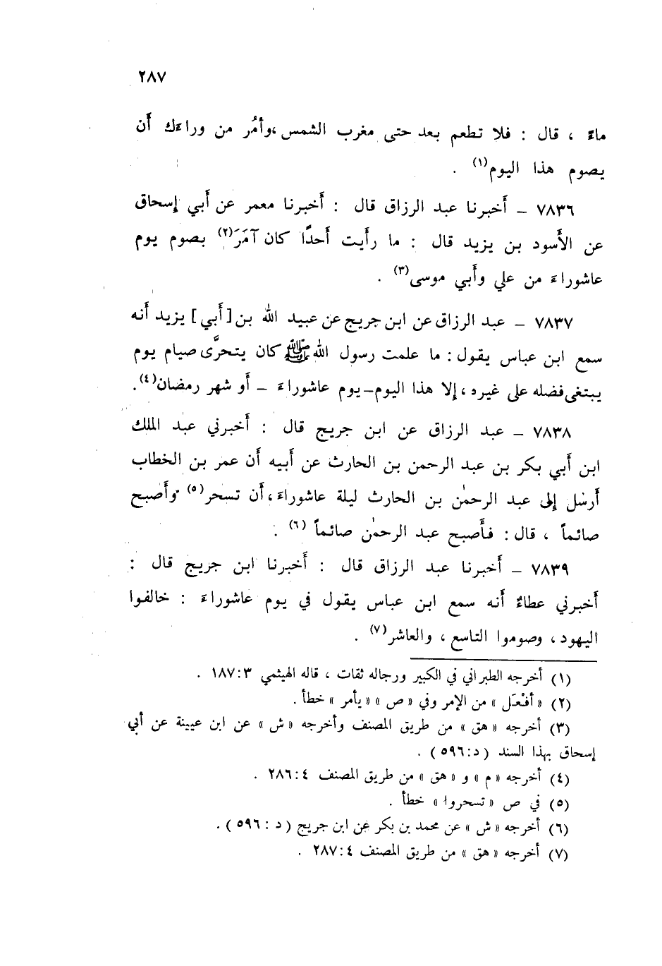 ٧٨٣٨ - عَنِ ابْنِ جُرَيْجٍ قَالَ: أَخْبَرَنِي عَبْدُ الْمَلِكِ بْنُ أَبِي بَكْرِ بْنِ عَبْدِ الرَّحْمَنِ بْنِ الْحَارِثِ، عَنْ أَبِيهِ، أَنَّ عُمَرَ بْنَ الْخَطَّابِ، أَرْسَلَ إِلَى عَبْدِ الرَّحْمَنِ بْنِ الْحَارِثِ لَيْلَةَ عَاشُورَاءَ أَنْ «تَسَحَّرْ، وأَصْبَحُ صَائِمًا» قَالَ: فَأَصْبَحَ عَبْدُ الرَّحْمَنِ صَائِمًا