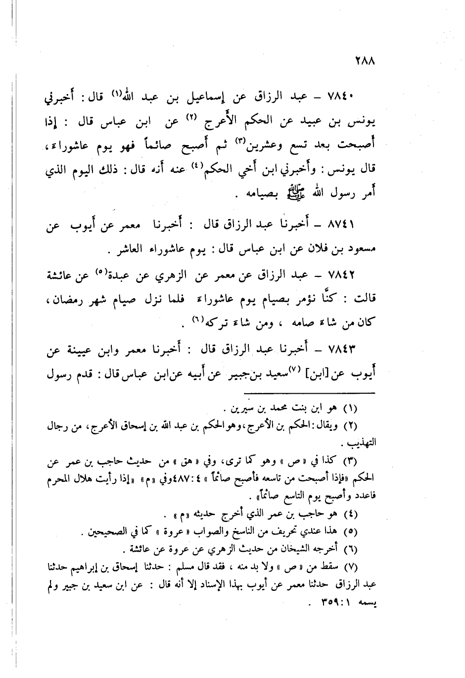 ٧٨٤١ - عَبْدُ الرَّزَّاقِ قَالَ: أَخْبَرَنَا مَعْمَرٌ، عَنْ أَيُّوبَ، عَنْ مَسْعُودِ بْنِ فُلَانٍ، عَنِ ابْنِ عَبَّاسٍ قَالَ: «يَوْمُ عَاشُورَاءَ الْعَاشِرُ»