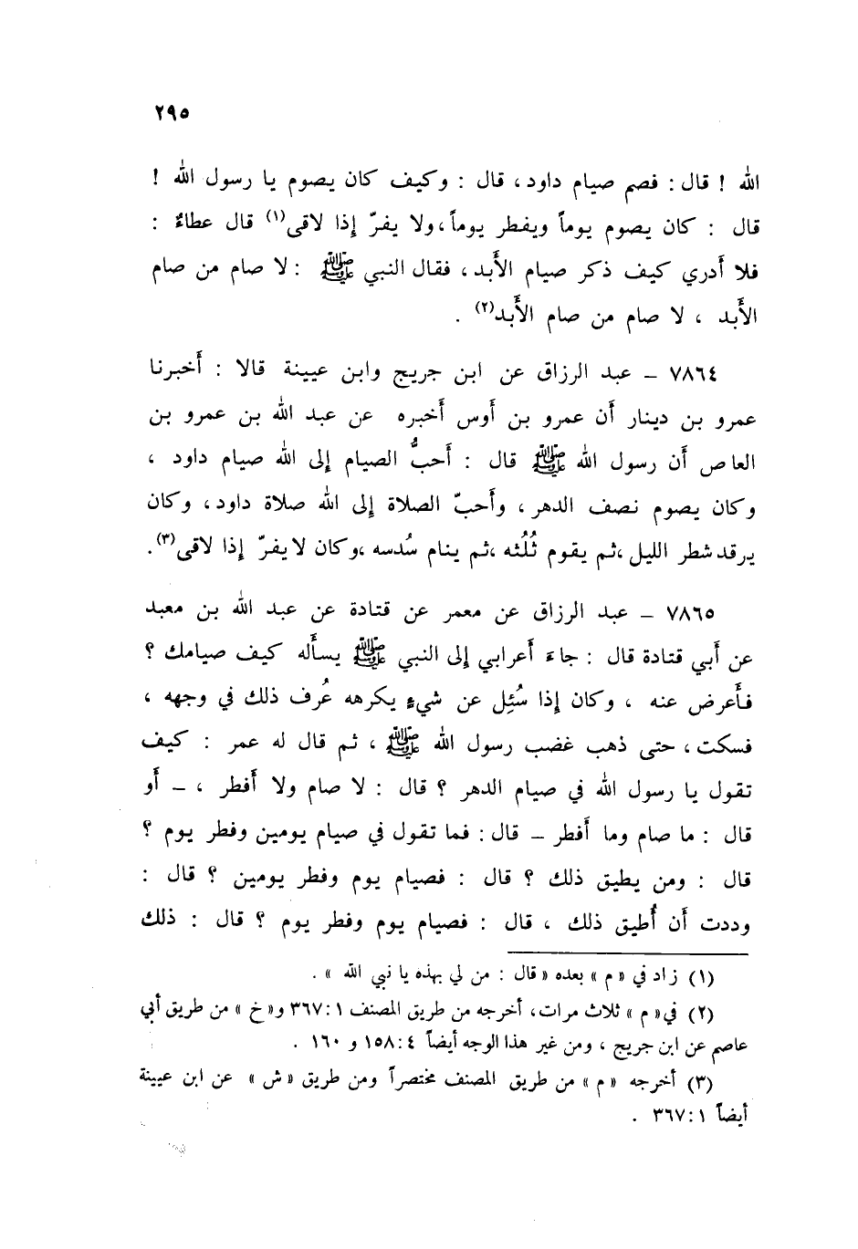 ٧٨٦٤ - عَنِ ابْنِ جُرَيْجٍ، وَابْنِ عُيَيْنَةَ، قَالَا: أَخْبَرَنَا عَمْرُو بْنُ دِينَارٍ، أَنَّ عَمْرَو بْنَ أَوْسٍ، أَخْبَرَهُ، عَنْ عَبْدِ اللَّهِ بْنِ عَمْرِو بْنِ الْعَاصِ، أَنَّ رَسُولَ اللَّهِ صَلَّى اللهُ عَلَيْهِ وَسَلَّمَ قَالَ: «أَحَبُّ الصِّيَامِ إِلَى اللَّهِ صِيَامُ دَاوُدَ، وَكَانَ يَصُومُ نِصْفَ الدَّهْرِ، وَأَحَبُّ الصَّلَاةِ إِلَى اللَّهِ صَلَاةُ دَاوُدَ، وَكَانَ يَرْقُدُ شَطْرَ اللَّيْلِ، ثُمَّ يَقُومُ ثُلُثَهُ، ثُمَّ يَنَامُ سُدُسَهُ، وَكَانَ لَا يَفِرُّ إِذَا لَاقَى»