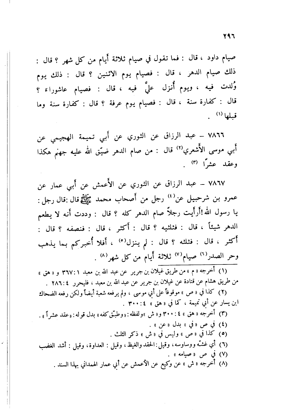 ٧٨٦٧ - عَنِ الثَّوْرِيِّ، عَنِ الْأَعْمَشِ، عَنْ أَبِي عَمَّارٍ، عَنْ عَمْرِو بْنِ شُرَحْبِيلَ، عَنْ رَجُلٍ، مِنْ أَصْحَابِ مُحَمَّدٍ صَلَّى اللهُ عَلَيْهِ وَسَلَّمَ قَالَ: قَالَ رَجُلٌ: يَا رَسُولَ اللَّهِ أَرَأَيْتَ رَجُلًا صَامَ الدَّهْرَ كُلَّهُ؟ قَالَ: «وَدِدْتُ أَنَّهُ لَا يَطْعَمُ الدَّهْرَ شَيْئًا» قَالَ: فَثُلُثَيْهِ؟ قَالَ: «أَكْثَرُ» قَالَ: فَنِصْفَهُ؟ قَالَ: «أَكْثَرُ» قَالَ: فَثُلُثَهُ؟ قَالَ: «لَمْ يَنْزِلْ، أَفَلَا أُخْبِرُكُمْ بِمَا يُذْهِبُ، وَحَرَ الصَّدْرِ، صِيَامُ ثَلَاثَةِ أَيَّامٍ مِنْ كُلِّ شَهْرٍ»