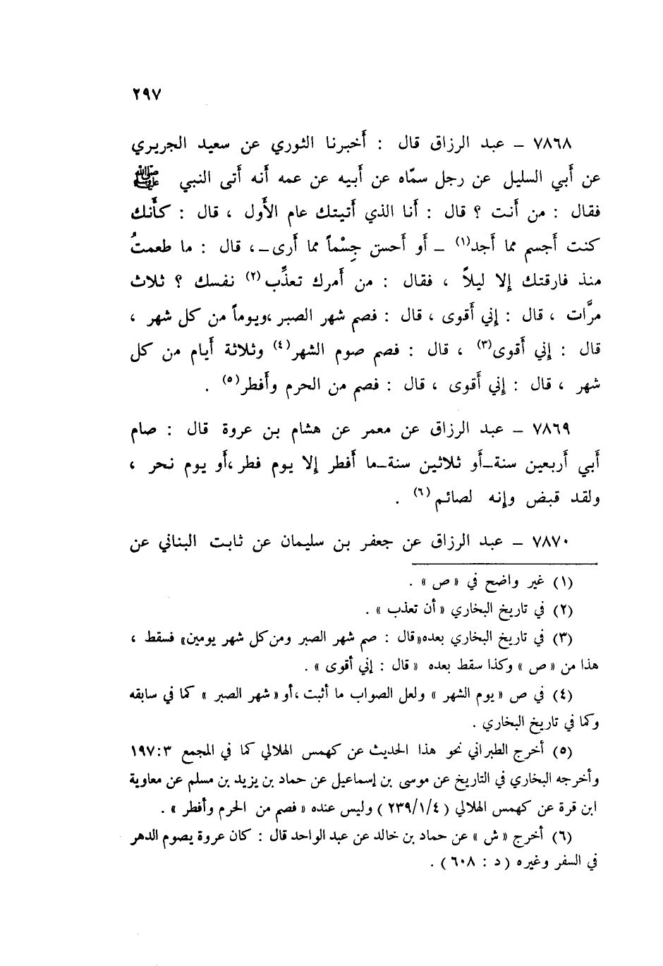 ٧٨٦٩ - عَنْ مَعْمَرٍ، عَنْ هِشَامِ بْنِ عُرْوَةَ قَالَ: «صَامَ أَبِي أَرْبَعِينَ سَنَةً أَوْ ثَلَاثِينَ سَنَةً مَا أَفْطَرَ إِلَّا يَوْمَ فِطْرٍ، أَوْ يَوْمَ نَحْرٍ وَلَقَدْ قُبِضَ وَإِنَّهُ لَصَائِمٌ»