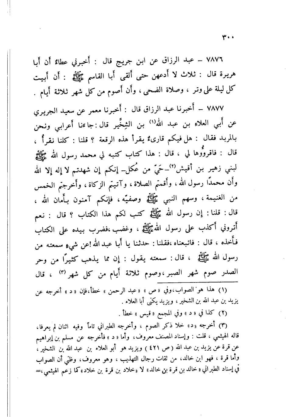 ٧٨٧٧ - عَبْدُ الرَّزَّاقِ قَالَ: أَخْبَرَنَا مَعْمَرٌ، عَنْ سَعِيدٍ الْجُرَيْرِيِّ، عَنْ أَبِي الْعَلَاءِ بْنِ عَبْدِ اللَّهِ بْنِ الشِّخِّيرِ قَالَ: جَاءَنَا أَعْرَابِيٌّ وَنَحْنُ بِالْمَرْبَدِ، فَقَالَ: هَلْ فِيكُمْ قَارِئٌ يَقْرَأُ هَذِهِ الرُّقْعَةَ؟ قُلْنَا: كُلُّنَا نَقْرَأَ قَالَ: فَاقْرَءُوهَا لِي قَالَ: هَذَا كِتَابٌ كَتَبَهُ لِي مُحَمَّدٌ رَسُولُ اللَّهِ صَلَّى اللهُ عَلَيْهِ وَسَلَّمَ لِبَنِي زُهَيْرِ بْنِ أُقَيْشٍ، حِيٍّ مِنْ عُكْلٍ «إِنَّكُمْ إِنْ شَهِدْتُمْ لَا إِلَهَ إِلَّا اللَّهُ، وَأَنَّ مُحَمَّدًا رَسُولُ اللَّهِ، وَأَقَمْتُمُ الصَّلَاةَ، وَآتَيْتُمُ الزَّكَاةَ، وَأَخْرَجْتُمُ الْخُمُسَ مِنَ الْغَنِيمَةِ، وَسَهْمَ النَّبِيِّ صَلَّى اللهُ عَلَيْهِ وَسَلَّمَ وَصَفِيِّهِ؛ فَإِنَّكُمْ آمِنُونَ بِأَمَانِ اللَّهِ» قَالَ: قُلْنَا: إِنَّ رَسُولَ اللَّهِ صَلَّى اللهُ عَلَيْهِ وَسَلَّمَ كَتَبَ لَكُمْ هَذَا الْكِتَابَ؟ قَالَ: نَعَمْ أَتَرَوْنِي أَكْذِبُ عَلَى رَسُولِ اللَّهِ صَلَّى اللهُ عَلَيْهِ وَسَلَّمَ، وَغَضِبَ فَضَرَبَ بِيَدِهِ عَلَى الْكِتَابِ، فَأَخَذَهُ